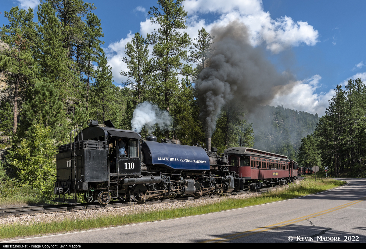 The long climb to Hill City. Working hard in reverse, Black Hills Central Locomotive #110 hauls the first westbound trip of the day from Keystone, SD to Hill City through the S-curves at about Milepost 6.3. With no turning facilities at either end of the line, and most of the locomotives facing east, the westbound trips on this line are typically run in reverse. Since most of the westbound run is uphill, the best stack-talk and the most dramatic smoke show on this line generally occurs with the engines running backward. Normally, I'm not a fan of photographing steam engines running this way, but historically, it was quite prototypical for these large, logging Mallets to run like this half the time.