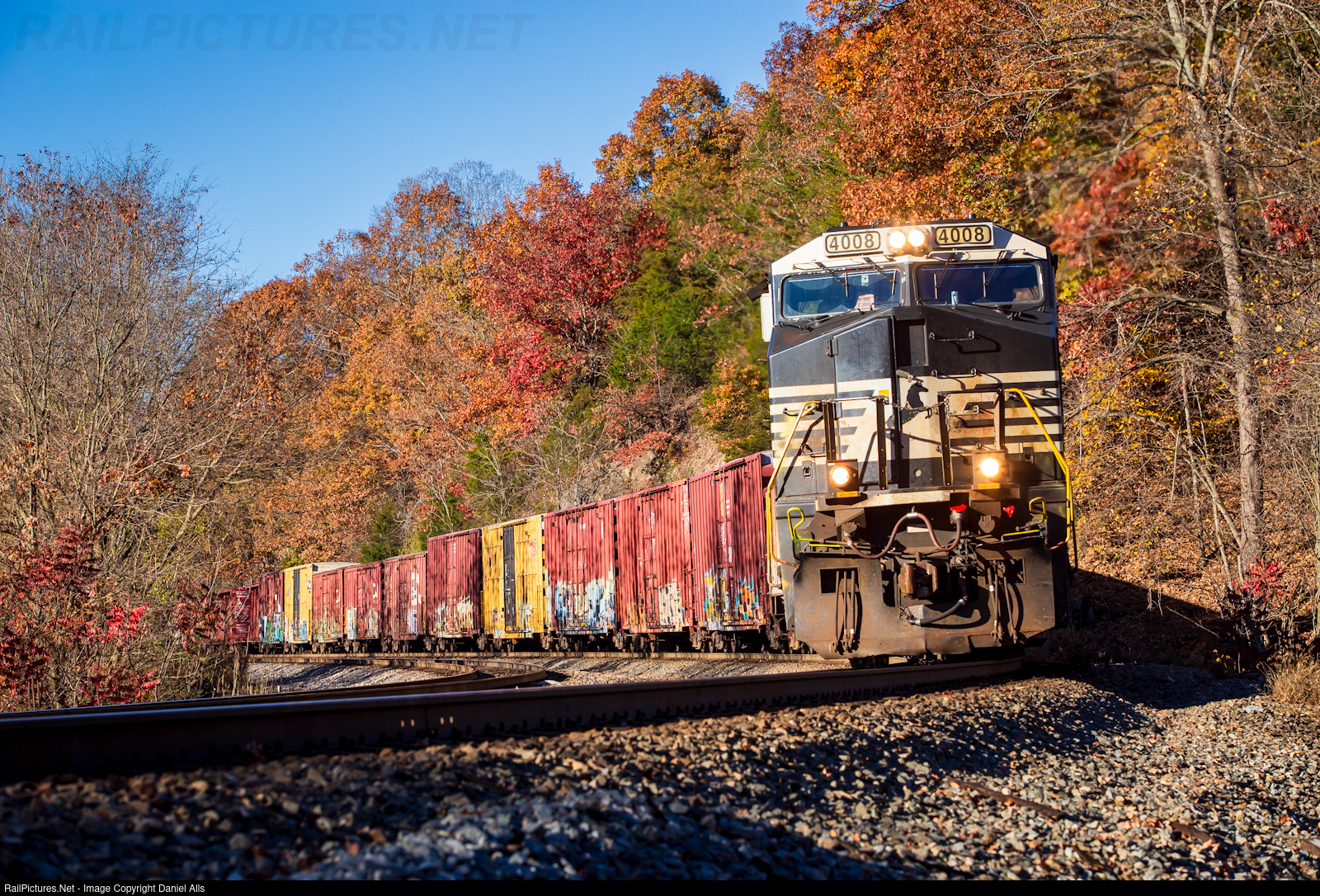 | Some of the last bit of color in the area could be found here near Friendship Road in Shawsville, VA. Manifest NS 14Z rushes down grade with an AC44C6M in charge. |