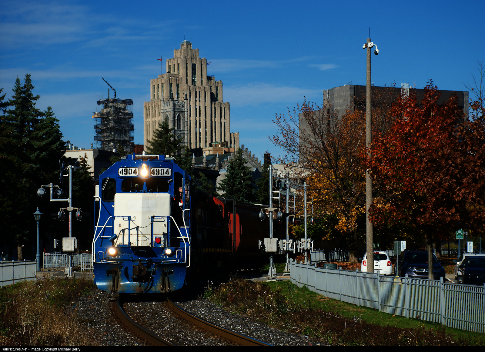 The conductor waves from CN 4904 as the Pointe St-Charles Switcher passes a bit of fall colours as it leaves the Port of Montreal.