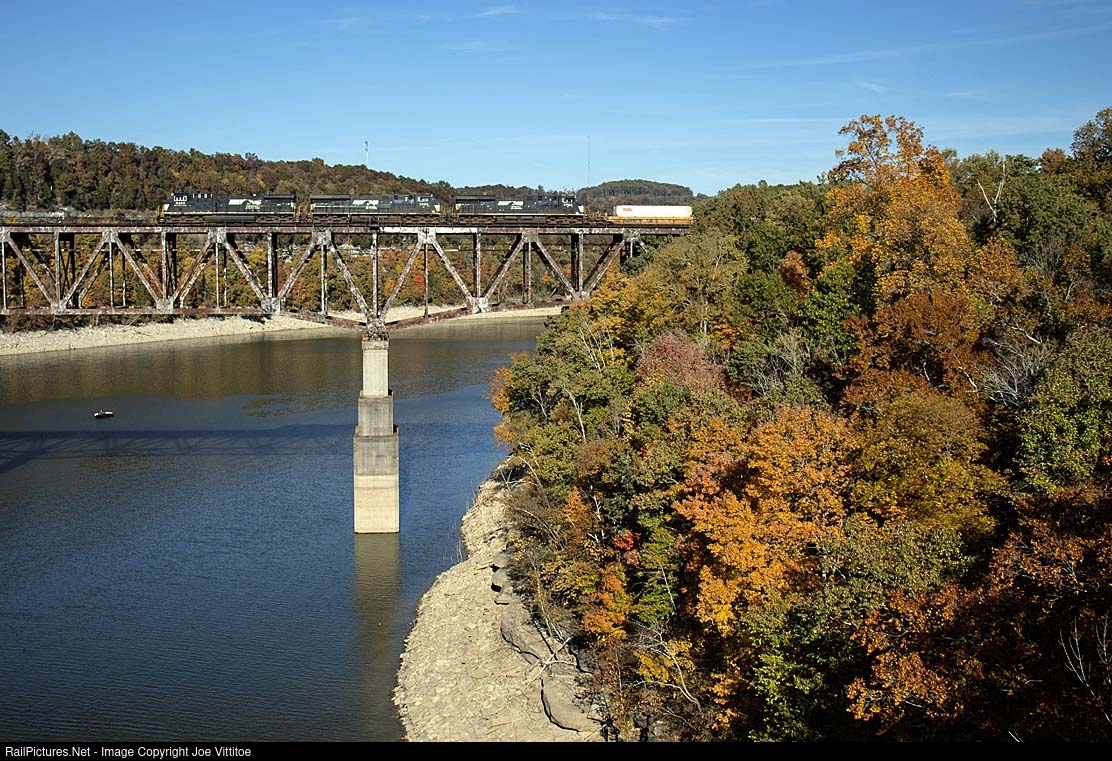 A NS northbound crosses over Lake Cumberland at Burnside on a beautiful autumn day.