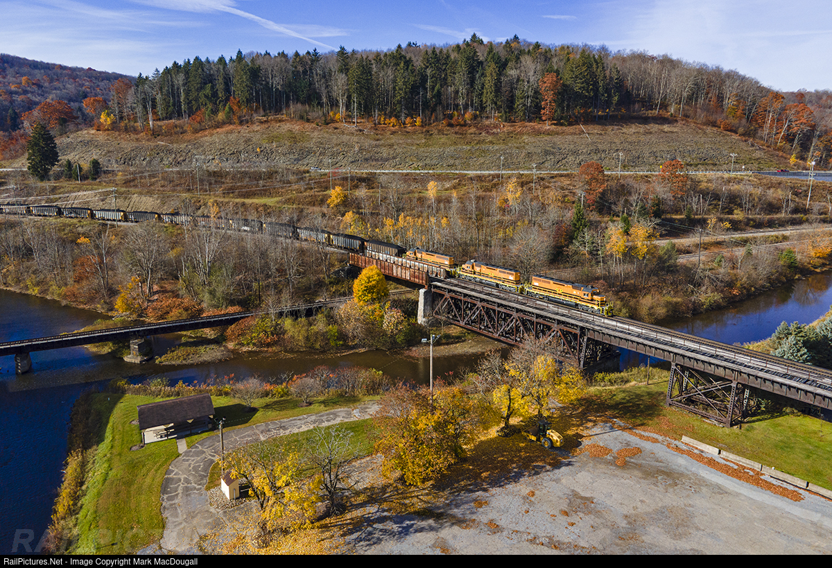 With 55 loads of coal in tow, XCOAL crosses the Clarion River on a cool fall morning. The train was loaded at Lady Jane Mine in Penfield, PA, and is bound for the South Buffalo, where the coal will be unloaded and shipped to Hamilton, Ontario.
