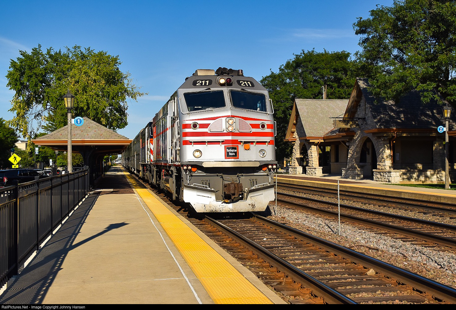 With it’s CB&Q heritage shining in the setting sun, METX 211 leads train 1263 as well with 186 into a station stop at La Grange, Stone Avenue, which has a vintage CB&Q depot.