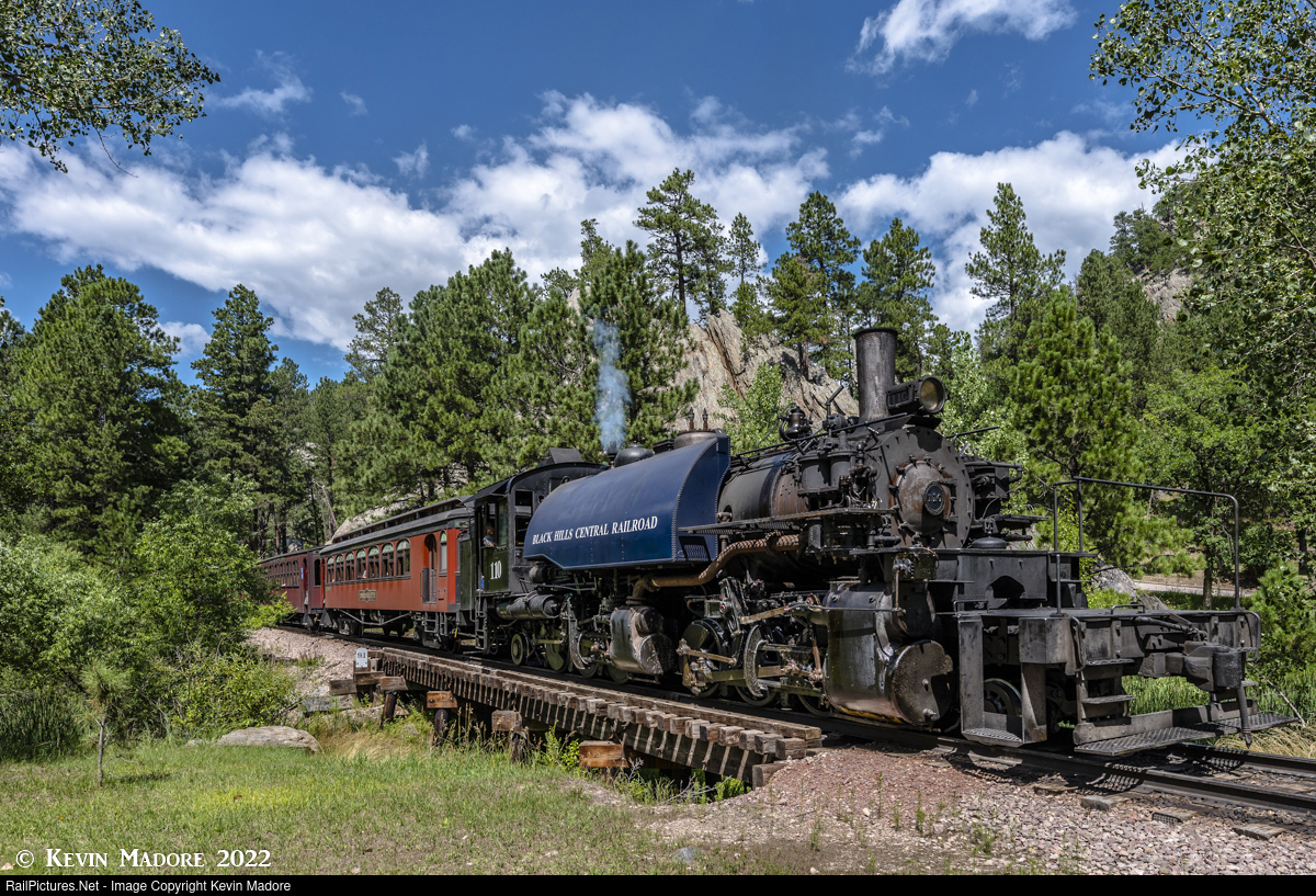 Milepost 9.1: Approaching Keystone. The old Chicago, Burlington & Quincy Branch line between Hill City, SD and Keystone features a number of timber trestles, many of which can be seen from Old Hill City Road. This one is at Milepost 9.1, less than a mile from the station at Keystone and just before the last of the 14 grade crossings that the line makes. Like many spots on this line, this one has light for most of the day. Here, we see Locomotive #110 with the second trip of the day, drifting downgrade and blowing for the crossing. Interestingly, with less than a mile to go, this train still has two more timber trestles to cross before it reaches Keystone.