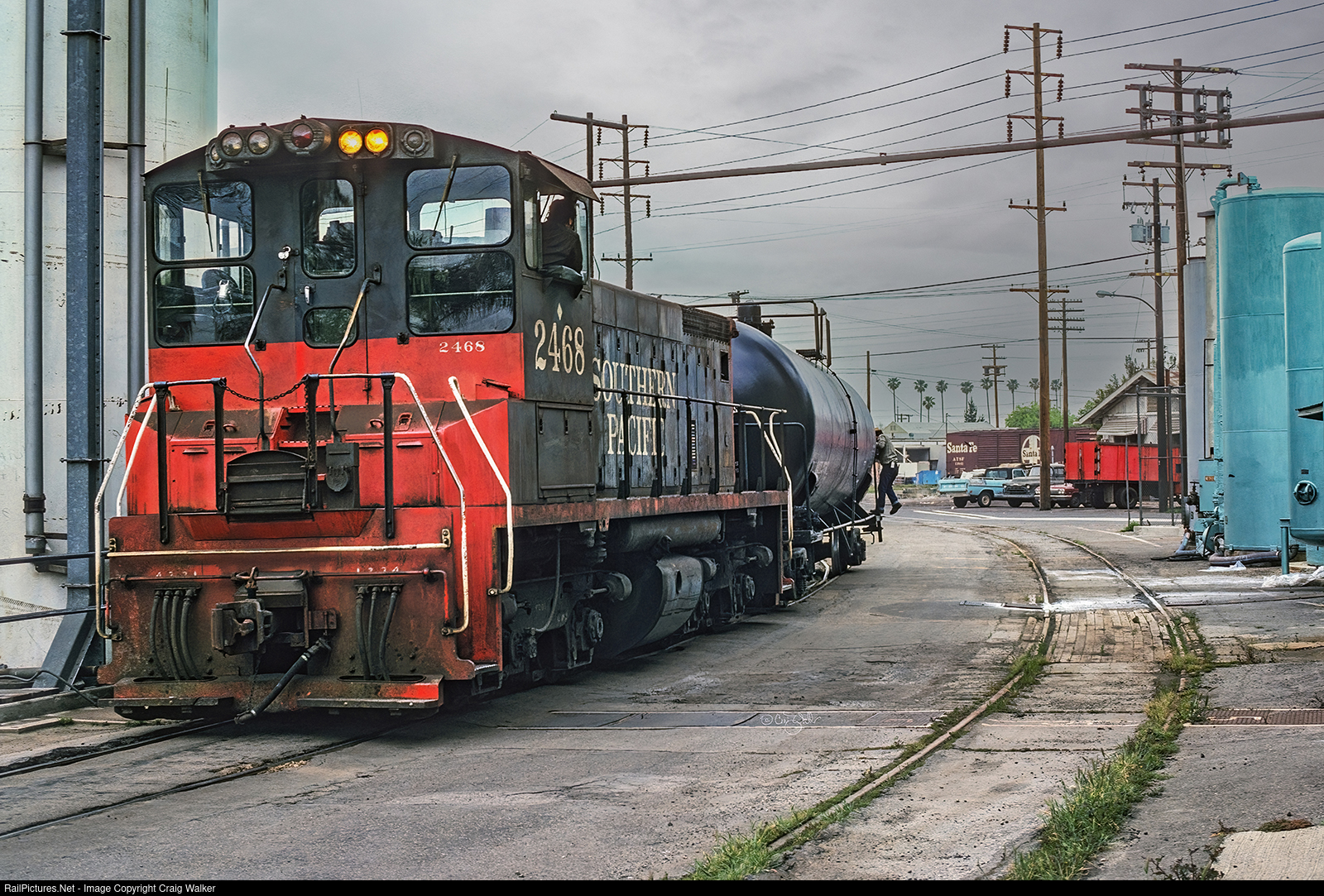 At one time, the Southern Pacific operated a line further east on Anaheim's Santa Ana Branch, operating down the center of Santa Ana Street, than it did not long before the Union Pacific acquired the SP. Heading east down the center of the street, the line diverged at Olive to head to Santa Ana (the portion still in operation), while another line continued east a bit more, then turned north through this industry (the name of which I have long-since forgotten) to parallel the Santa Fe Railway's Surf Line (note the Santa Fe box car in the distance) to connect with the Union Pacific's Anaheim Branch at Lincoln Avenue. SP SW1500 2468 was first spotted running on UP's Anaheim Branch through Fullerton, then got back on home rails just north of here, where it is setting out a tank car. The train will then continue to the SP's West Anaheim Yard, trundling down Santa Ana Street as it does so. This locomotive later became Union Pacific 1074, and later LTEX 1074. To see it in service in Edison, New Jersey, forty years after this photo, click HERE. (Anaheim, California – April 1975)