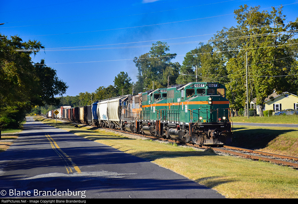 | Georgia and Florida Railroad train GF86 pulls hard up Pelham Hill with OMLX 4007 a GP40-2LW formerly owned by Canadian National leading the train towards Thomasville.