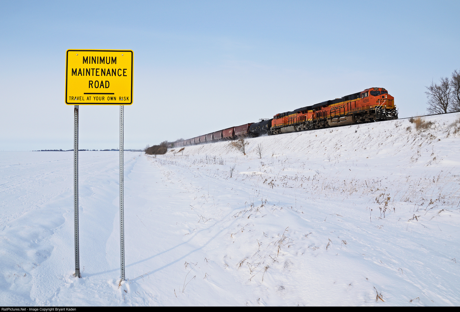 | Minimum maintenance roads are pretty common in western Minnesota. Some people may be disturbed by such road signs as more proof that yes, you are indeed in the middle of nowhere. As someone who loves living out here on the prairie, I know that sometimes the fun begins where the maintenance ends. A southbound BNSF manifest rolls down the long fill just south of Hancock, MN on a chilly winter day. |