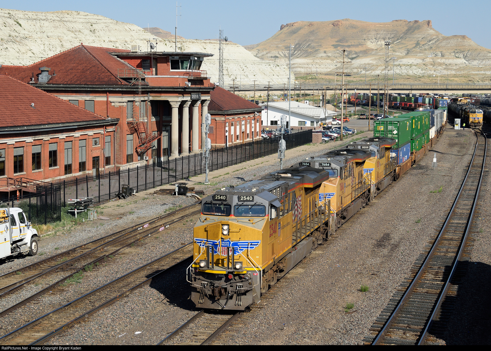 A westbound intermodal train departs Green River after a crew change, passing the large depot that still stands. I was inspired to stop on the famous "railfan bridge" while on a family vacation, mostly because of a Victor Hand photo I'd seen in "Union Pacific Mainline West," which was one of my favorite railroad photography books as a kid. His photo had a GP30 and a couple of DD35 B units, but Green River is still a great place to watch trains with the iconic cliffs in the background and lots of activity in the yard.
