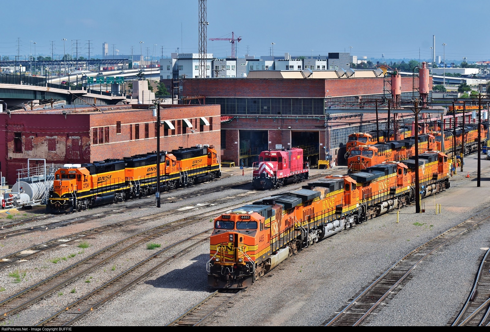 | There is a stranger in the pumpkin patch as a red GP7U motor destined for the Denver Rock Island Railroad waits at the BNSF engine servicing facility in Denver, Colorado.