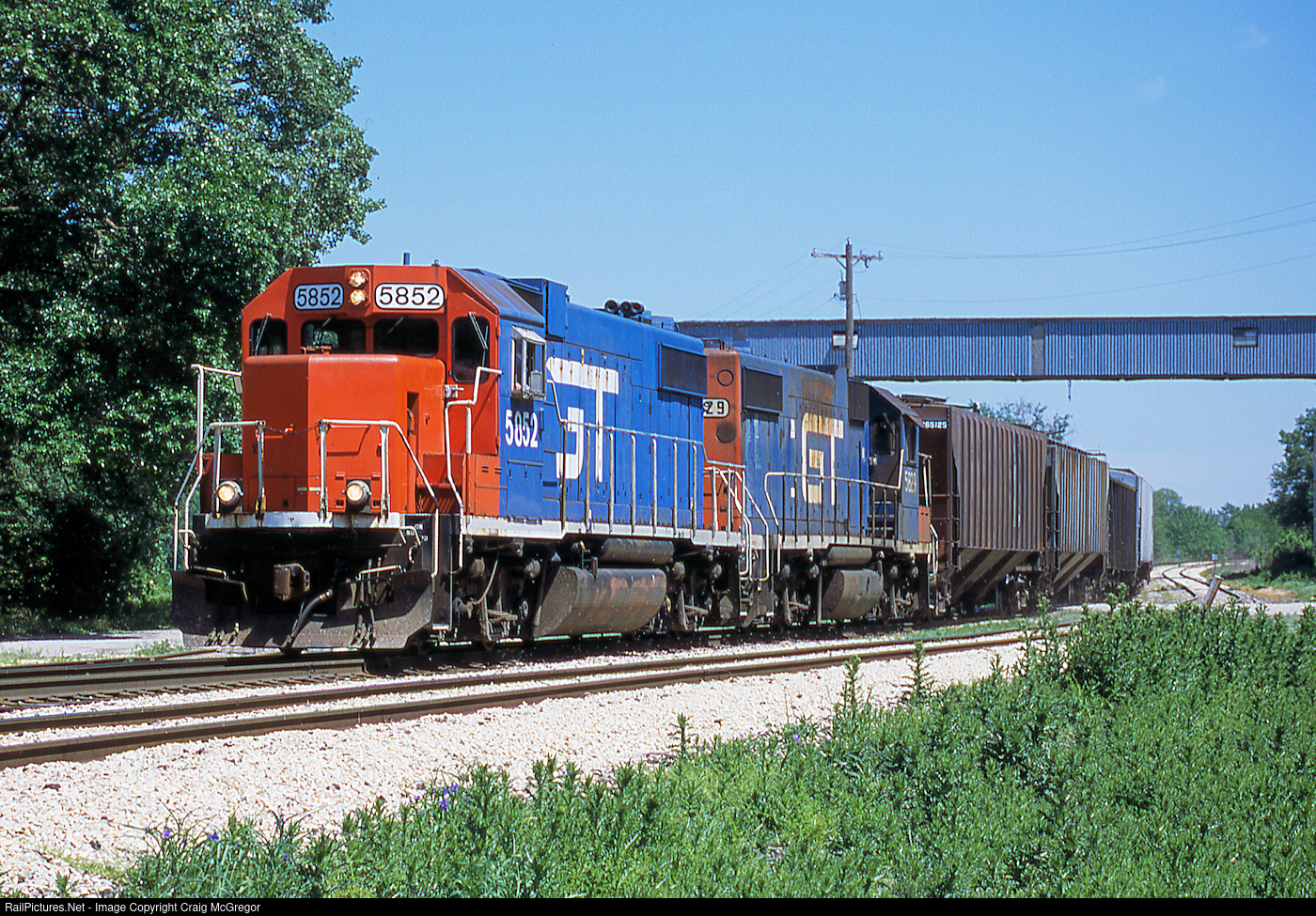 GTW5852, in its original GTW paint scheme, rolls the Peoria Local south through Creve Couer. Back in 2001, the Peoria Local ran a steady diet of GTW GP38's. See photo #816357 for this same locomotive, same service and same location, but with new paint.