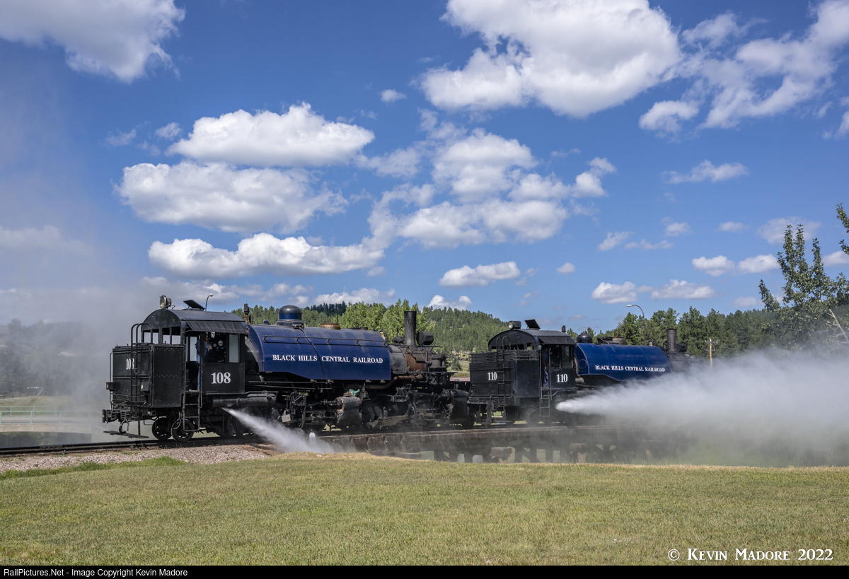 Two of a kind. Two of a kind may be a common hand in poker, but it's certainly not a common hand when it comes to steam tourist railroads. Outside of the Colorado Narrow Gauge lines, it is uncommon to find pairs of virtually identical steam locomotives at all, much less find them at the same railroad. But such is the case at the Black Hills Central, which is luck enough to own two of the three extant, operable Baldwin 2-6-6-2T Compound, Articulated, Mallet Saddle-Tankers. Built in 1926 and 1928 respectively, Black Hills Central Locomotives #108 and 110 are indeed nearly identical, boasting 37,500 lbs. of tractive effort each. The most obvious difference between the two is that #108 has a full saddle-tank, whereas #110 has a split saddle, similar to a set of side tanks. There are also minor differences in the pilots on the front of both locomotives. In this rare view, we see the pair teamed up for an afternoon double-header celebrating the 65th anniversary of the Black Hills Central as a tourist railroad. Both locomotives are sitting on the small wooden trestle at Milepost 0.1, conducting simultaneous blow-downs, which needless to say, attracted a lot of attention from passers-by.