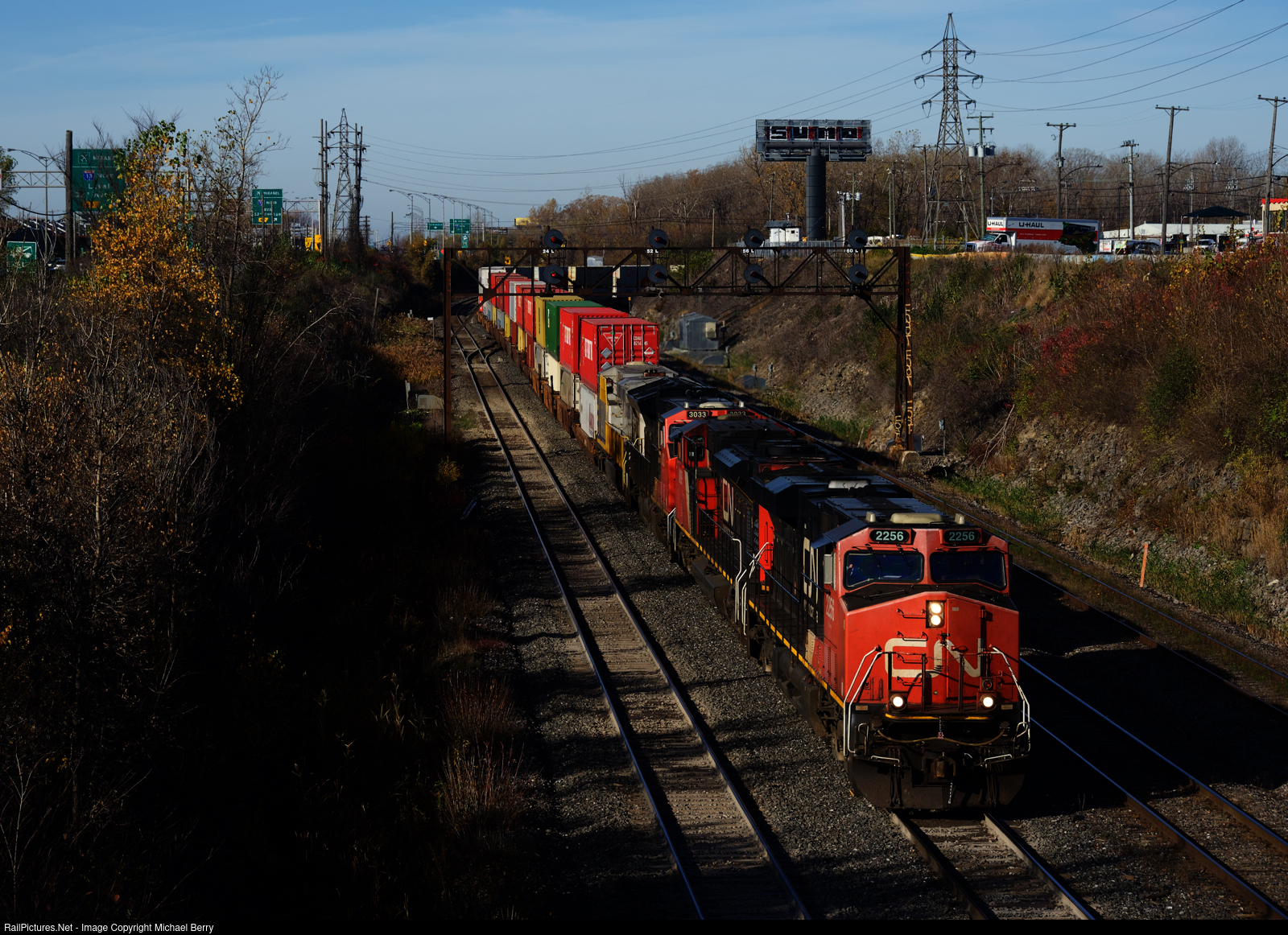 | CN 120 is exiting Taschereau Yard with CN 2256, CN 8899, CN 3033 & CN 2761 for power. |