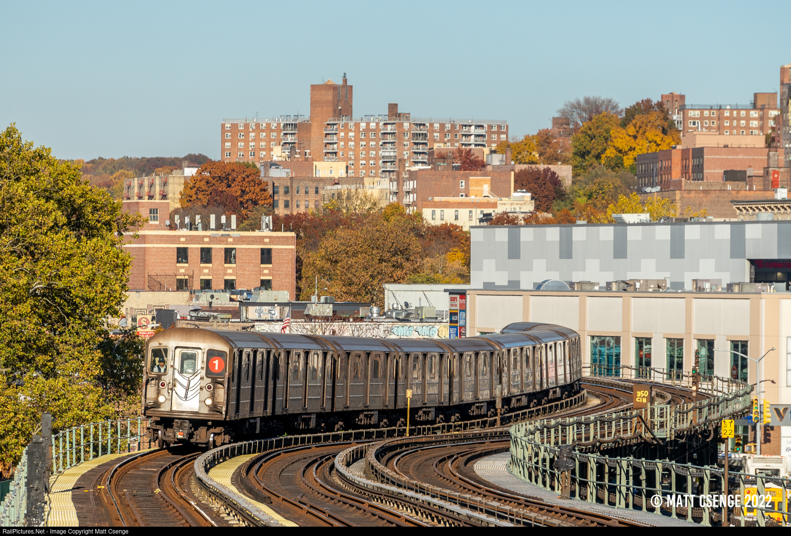 A Manhattan-bound 1 train (Bombardier R62A, 1984-1987) is seen about to enter the borough of Manhattan as it approaches Marble Hill-225th St Station on the Broadway-7th Avenue Line.