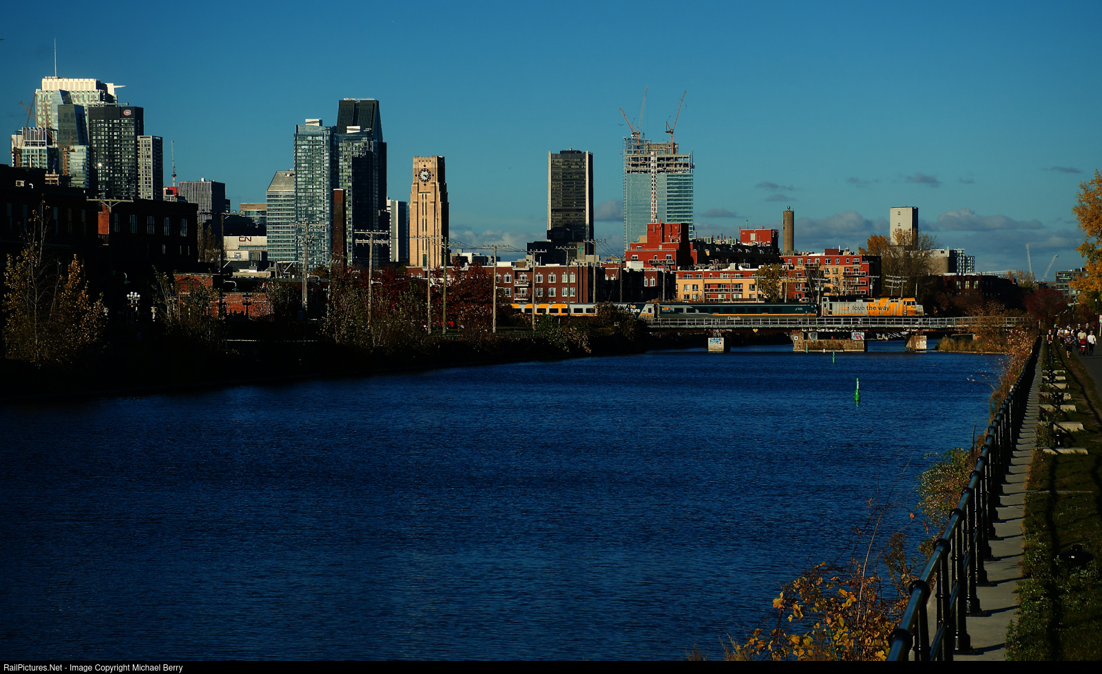 Wrapped VIA 6436 leads VIA 26 from Ottawa over the Lachine Canal.