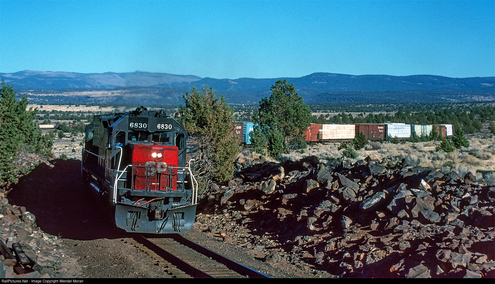 | With the Warner Mountains for a backdrop, an eastbound manifest on the Modoc Line exits Indian Camp Loop. Earlier in the month, Modoc trackage between Alturas and Wendel had been reactivated following the Rio Grande-Southern Pacific merger. Today, this grade is a hiking trail. |