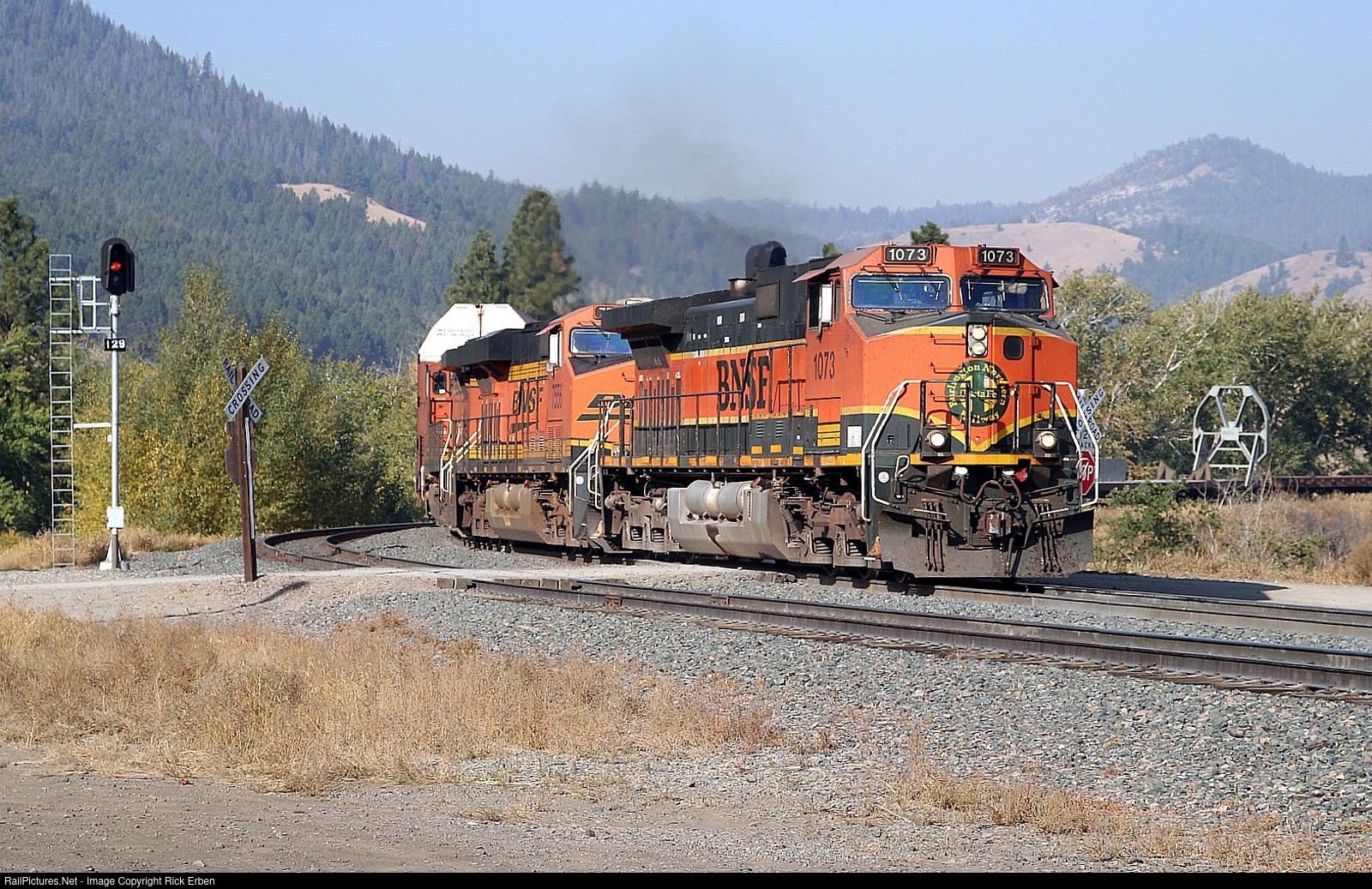 A Heritage I Dash9 leads an eastbound manifest with Boeing airplane part empties on the head end, negotiating the tight curve at Austin, MT on the railroads' precipitous drop from Mullan Pass. There's a bit of forest fire haze in the morning air, here in Big Montana.