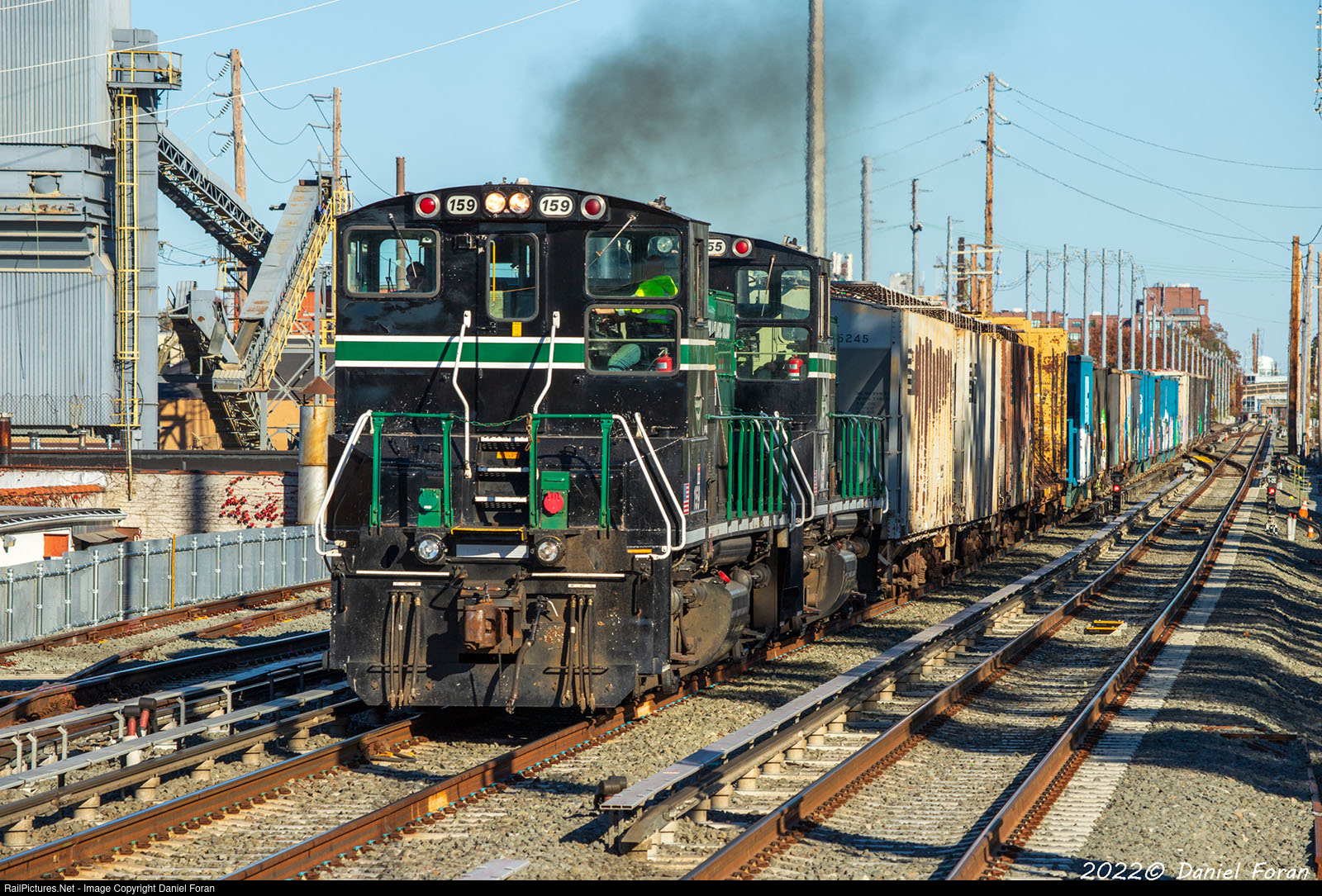 | After crossing over from Mainline 3 to 1 at NASSAU 1, the RS41 is seen in 8th notch with black smoke pouring out from the stacks as they make the trip back to Fresh Pond after switching at EWG Glass Recovery and Recycling and One World Recycling. |