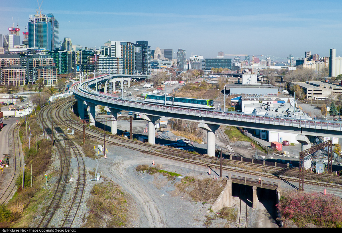 | A married-pair unit of Alstom's Metropolis cars (called the Saint-Laurent model) is seen here on the new REM (Réseau Express Métropolitain) right-of-way alongside CN's St-Hyacinthe subdivision at Pointe-Saint-Charles, heading for the temporary terminus at Gare Centrale. These test runs started recently and will qualify the system for opning of passenger service in early 2023. |