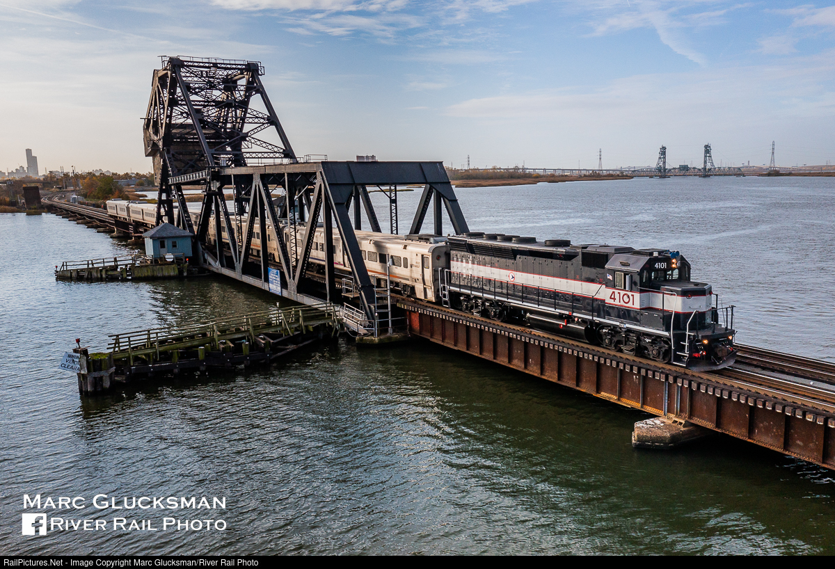 DOT On The River. On Sunday, November 6, 2022, NJ Transit 4101 (née-CNJ 3672, NJ DOT) makes its way across the Hackensack River over HX Draw. The NJDOT scheme was first applied to the U34CH and later made its ways across the fleet during the 1970s. This unit joins 4109 in its as delivered paint as a second "heritage geep" and a variety of wrapped units for other railroads and U.S. Armed Forces related designs. This unit will see service on Hoboken based lines, so keep an eye out for it the next time you ride NJT and an ear out for its Leslie SU3L horn!