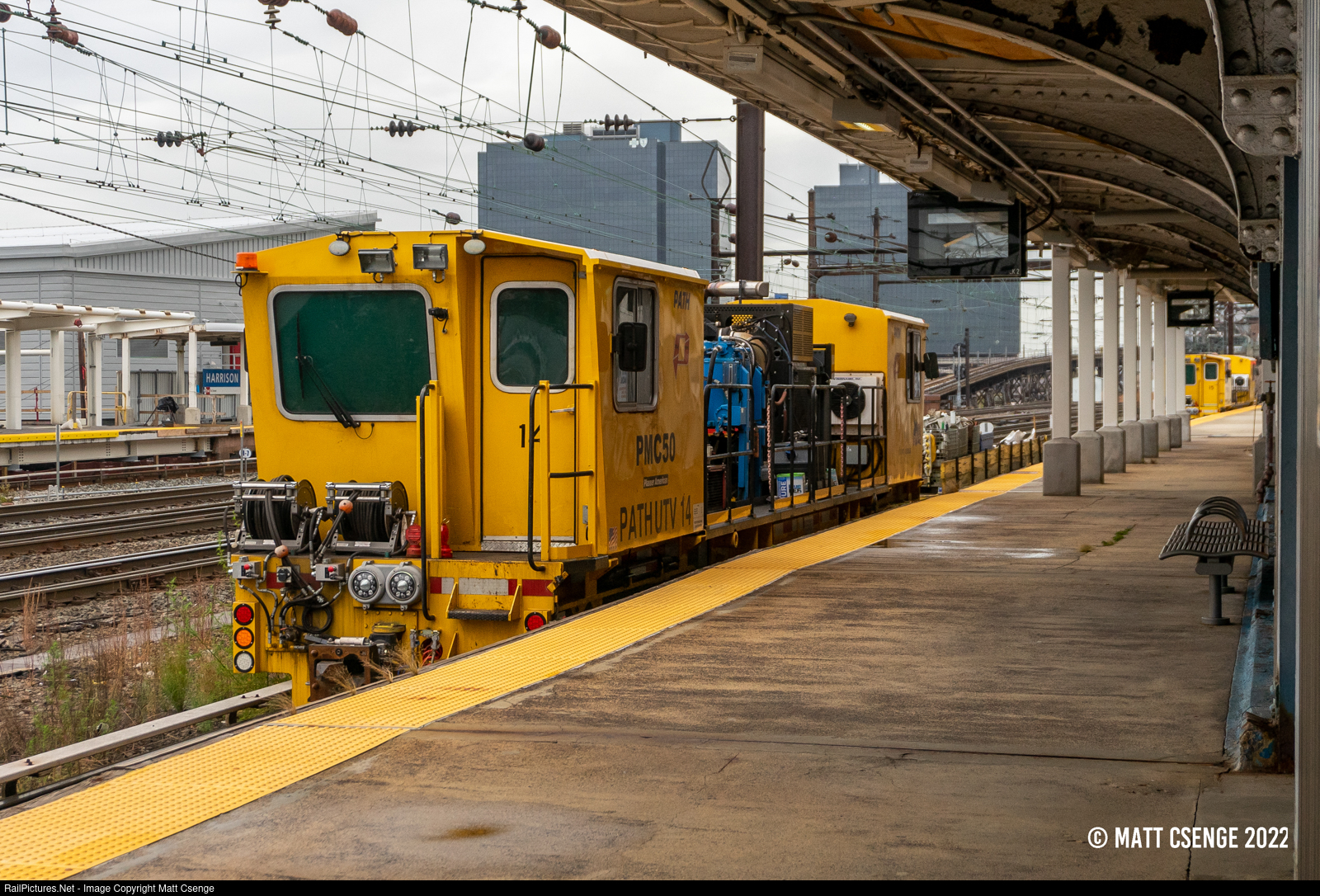 PATH UTV 14 (Plasser American PMC 50) is seen sitting at Harrison Station, awaiting track maintenance workers to return from lunch break. In the background, UTV 15 can also be seen further down the platform. These prime movers are commonly seen laid up in the Harrison Car Maintenance Facility, but are uncommon to see out on the system! |