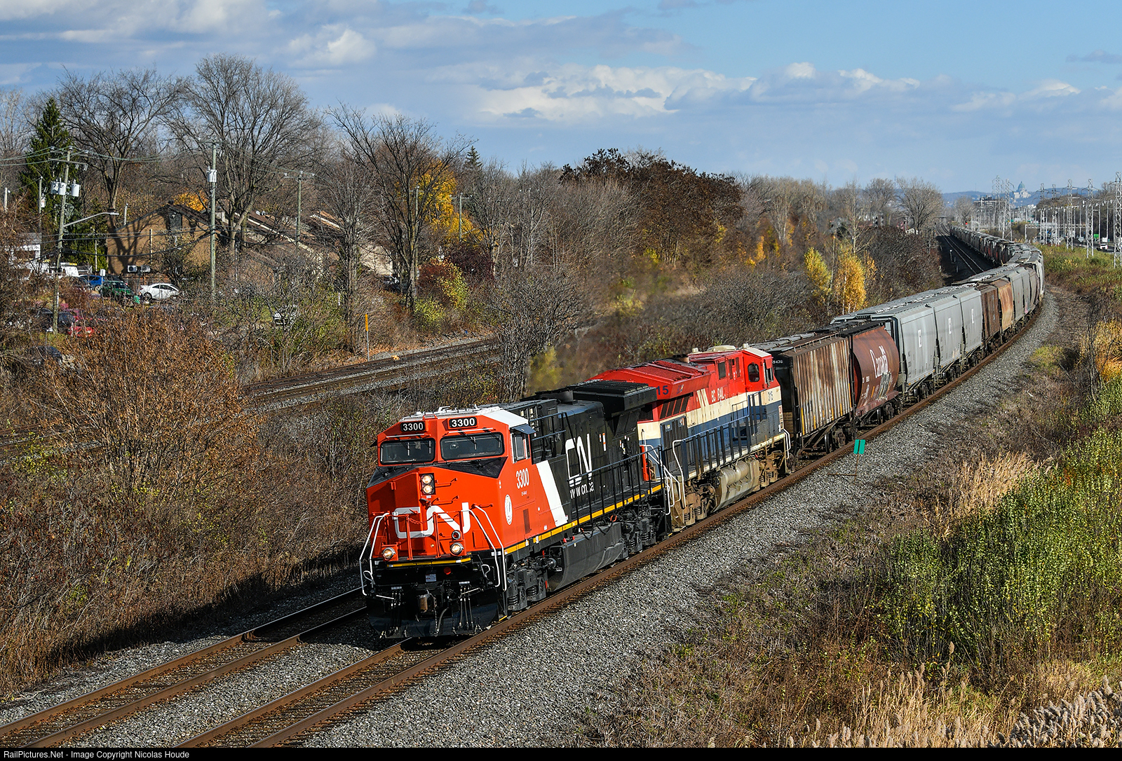 CN 3300 and CN 3115 are in charge of 94 empty grain cars bound for Symington. CN 3300 (ex-CN 2641) is the first in an order of 50 Dash 9-44CW to be rebuilt as AC44C6M by Wabtec in their Fort Worth, Texas plant.
