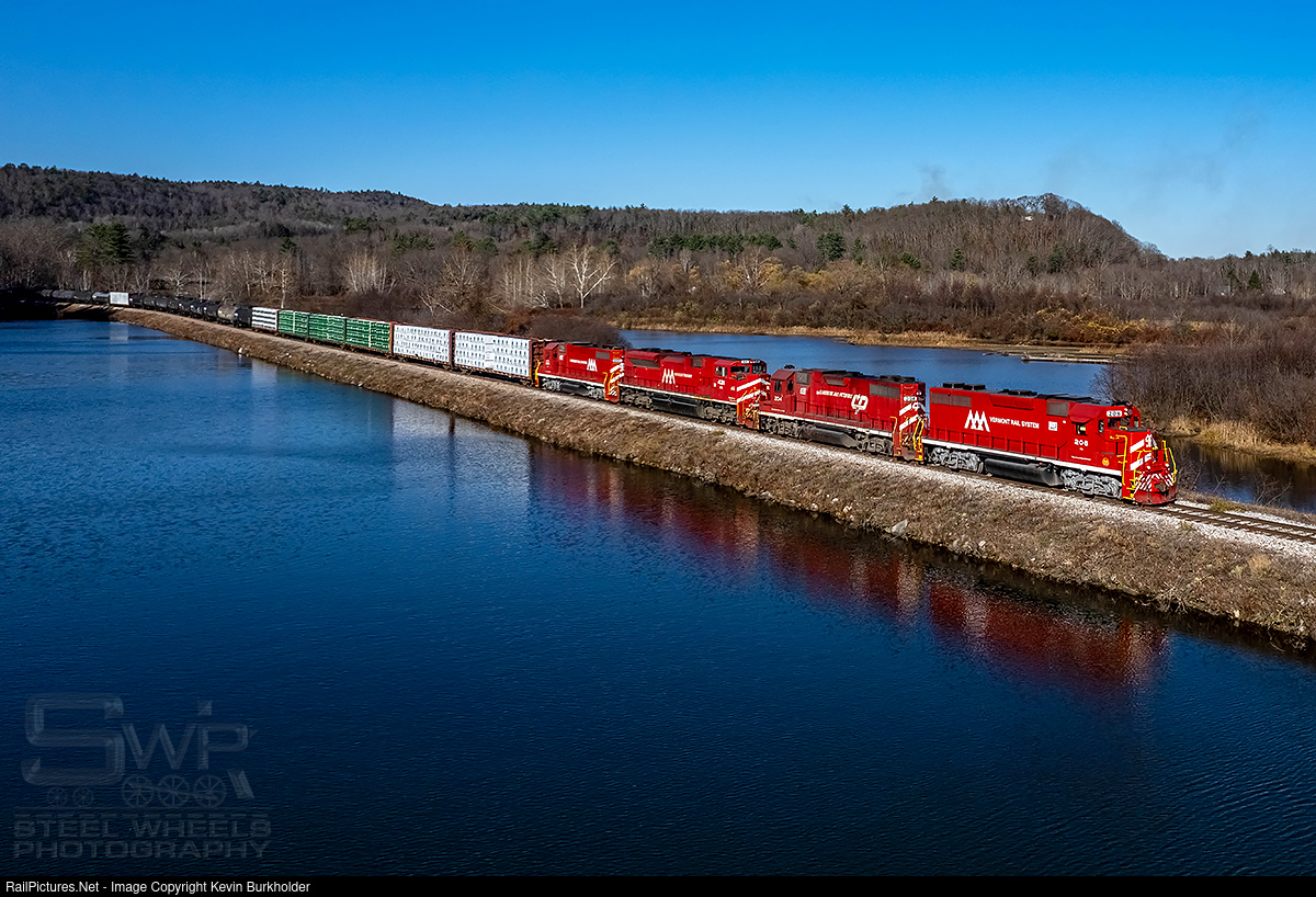 The November 7, Vermont Rail System GMRC train 263 rolls along the Connecticut River at Rockingham, Vermont, with recently repainted VTR GP38-2 206 leading CLP GP38-2 204, SD70M-2 431 and VTR GP38-2 201.