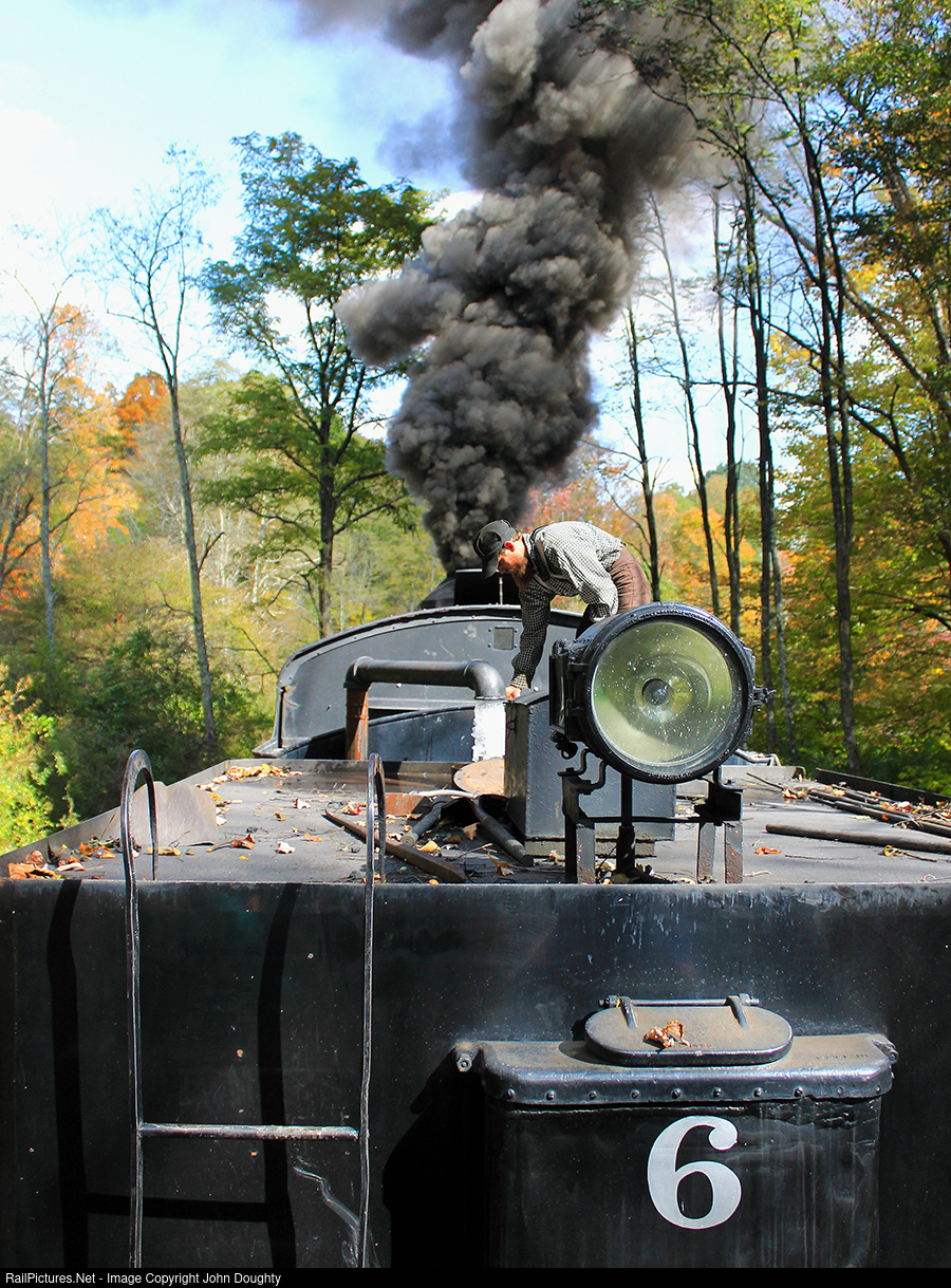| The fireman on the Durbin & Greenbrier number 6 checks the water flow that is being fed from a creek that flows into the Greenbrier river. After the water tank was filled, the train headed north back to Durbin. |