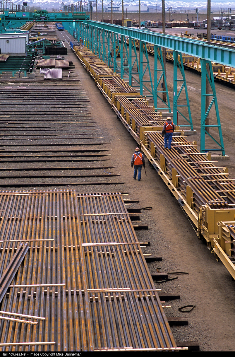 | A string of flatcars loaded with rail is prepared for unloading at Union Pacific’s welded rail plant at Laramie, Wyoming, on March 25, 2008. |