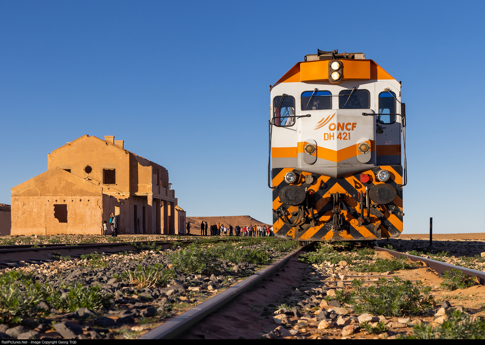 The ORIENTAL DESERT EXPRESS in the east of Morocco from Oujda to Bourfa circulate about 2 times a year, but it is intended to run about 10 trains in 2023, perhaps. The train with 6 cars and diesel locomotives DH # 421 and # 430 of the ONCF stopped in Tendrara on 1374 meter a.s.l. The line sees nor regular freight nor passenger service since decades, but was not shut down for strategic reasons (proximity to the Algerian border). At this location in the desert, scenes of the James Bond film "Spectre" were shot. https://www.youtube.com/watch?v=ZjyOFPXvh7U