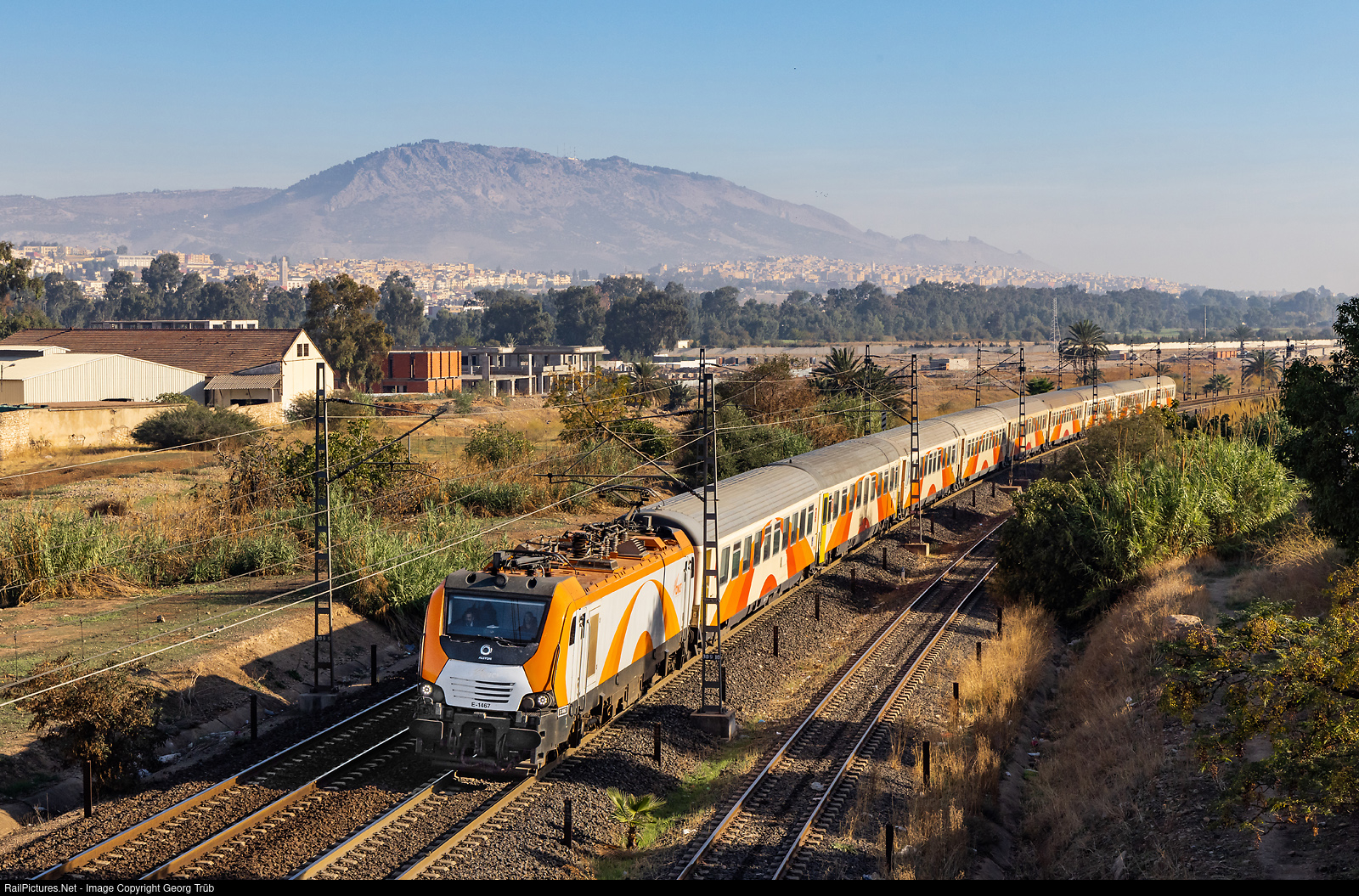 | Alstom Prima II locomotive E # 1467 of the ONCF is leaving Fes with the 9.40 AM passenger "Al Atlas" to Meknes-Rabat-Casablanca-Marrakech. 50 of this 5500 kW E-1400 locomotives for 3000 V DC and 160 km/h maximum velocity were built by Alstom in Belfort/France in two series from 2010/2019, # 1402 to # 1420 and # 1451 to # 1480. |