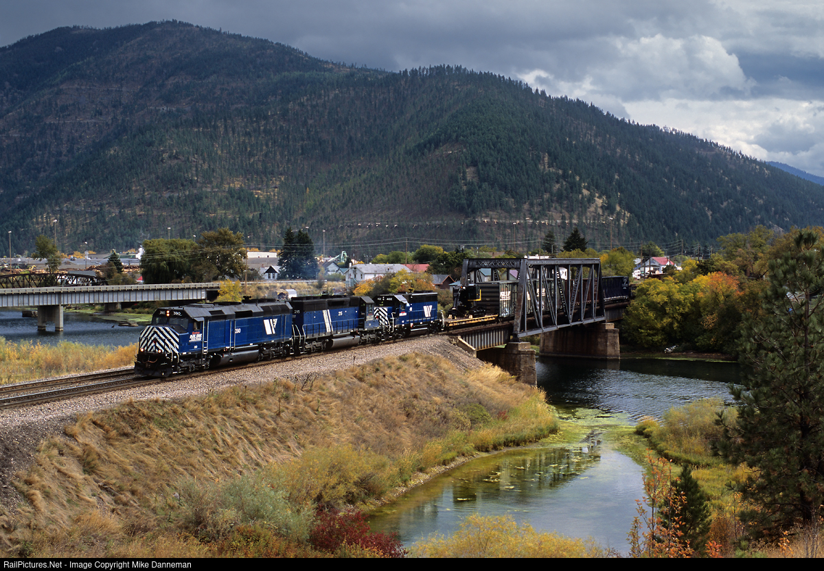 Montana Rail Link’s Laurel to Missoula manifest freight, called the LM, crosses the Blackfoot River at Bonner, Montana, on October 7, 2005. Three MRL EMDs power the train—F45 No. 390, SD40 No. 215 and GP35 No. 402.