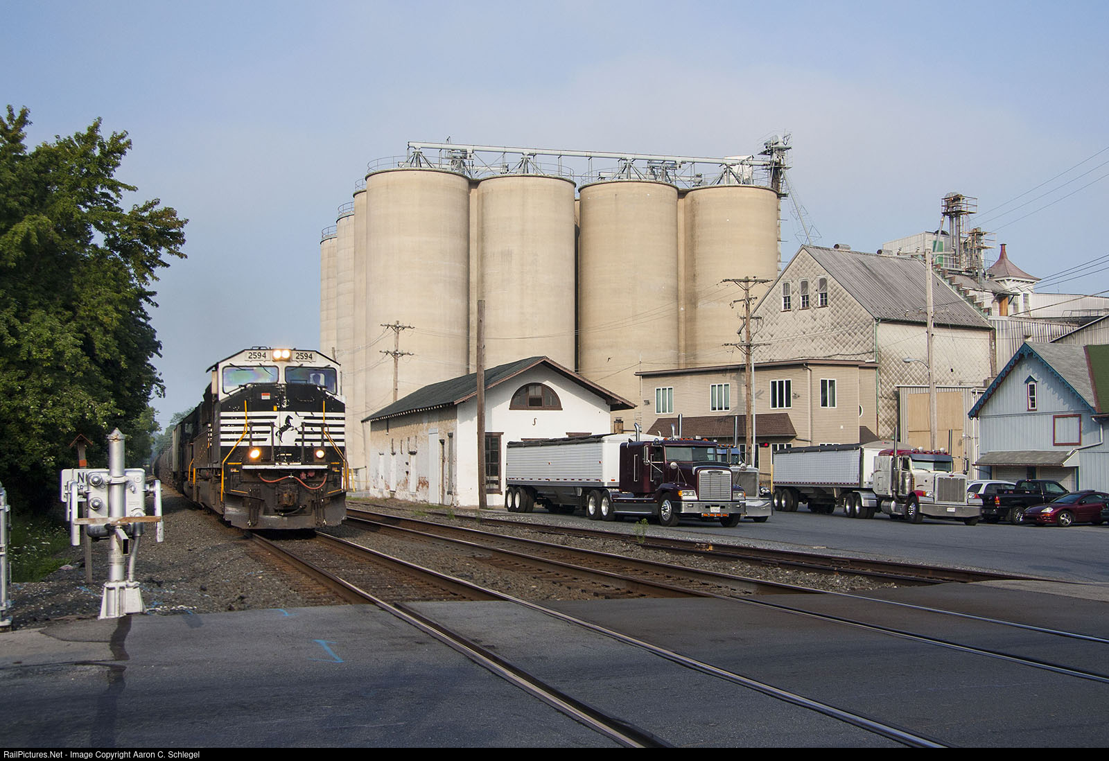 NS 2594 roars East Bound through Fleetwood, PA on the NS Reading Line. Two 18 wheeler s sit at F M Brown's Sons grain elevator.