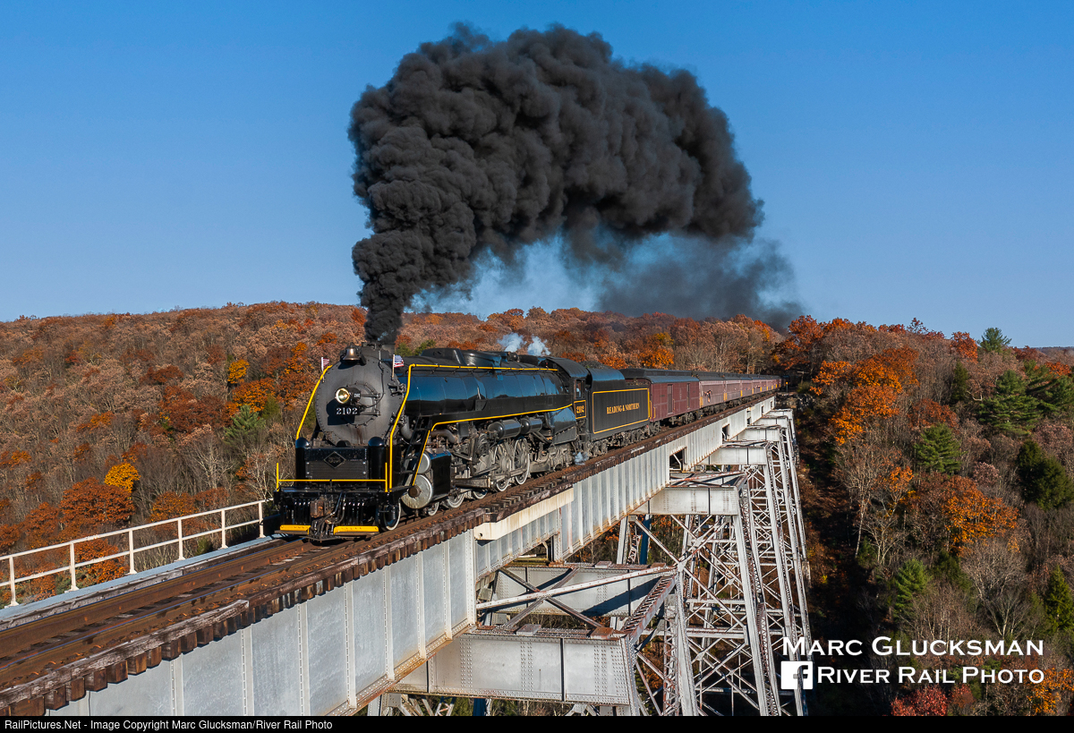 R&N Passenger Steam, Take 2! On October 8, 2022, a trip to the Reading & Northern Railroad to catch former Reading Railroad 4-8-4 T-1 RBMN 2102 running with a passenger train did not work out as planned. A recent repair did not hold up and the engine was taken out of service and replaced with diesels in Port Clinton before I was able to record a shot. However, on Saturday, October 29, 2022 during a return visit to the Lehigh Valley area, the T-1 did not disappoint, running with 18 coaches and no assistance. As it crossed Hometown Trestle near Tamaqua, Pennsylvania during the return trip to Reading, Pennsylvania under a crystal blue sky during the fall foliage season, a plume of smoke accents a wonderful scene towards the end of this engine's first year of service in decades.