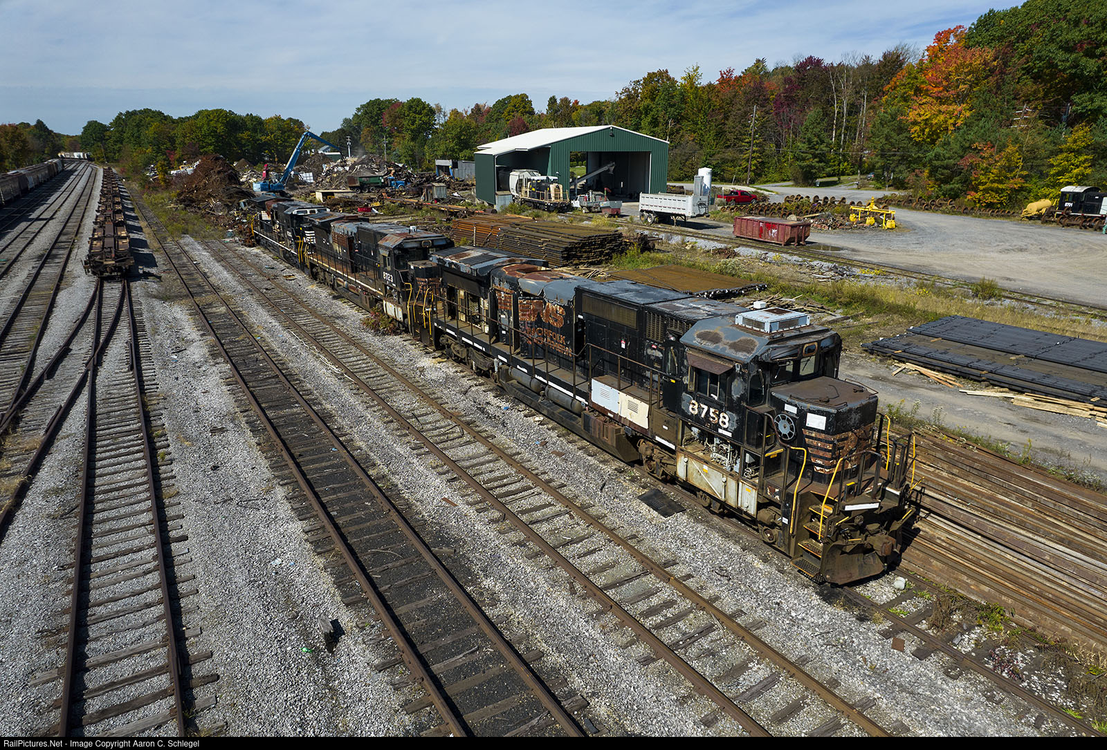 | Still Awaiting the scrappers torch the NS 8758 has been here for a number of years now. Sort of a macabre scene for lovers of old locomotives. As uncomfortable as they can be to operate for the crews, its always cool to see older power on the road. |