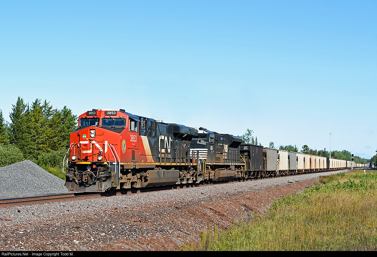 | Approaching S. Fairlane back through N. Fairlane and with the tail end still crossing over the St. Louis River, CN 3853 leads about 20,000 tons of taconite pellets along the CN Missabe Sub. |
