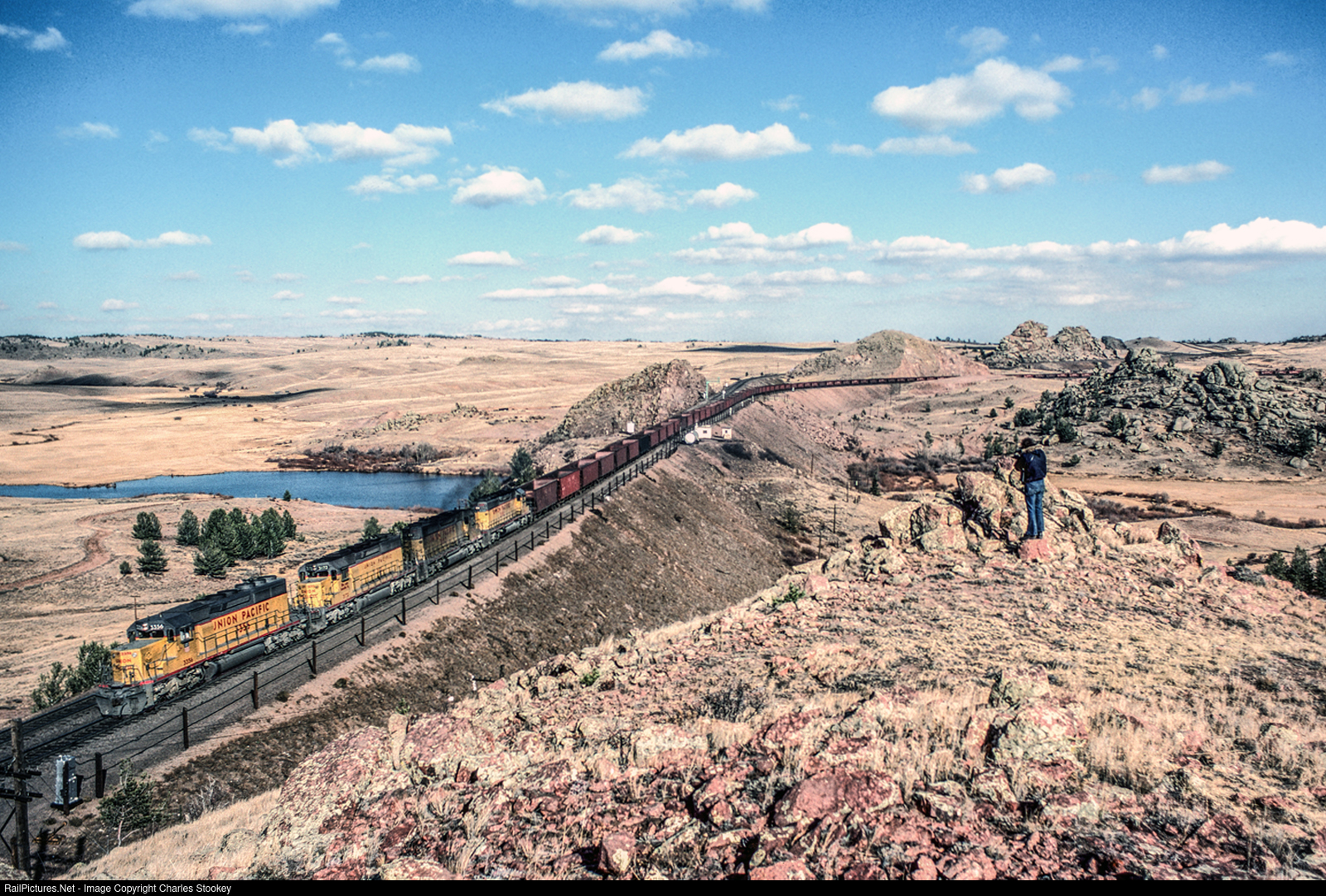 | Dale WY Oct. 19 1977 — A fellow railfan lines up his shot as Union Pacific SD40-2 3356 leads a hopper train across the Dale Creek fill on track two. The train has come west on track three which joins tracks one and two from the right. My photo.