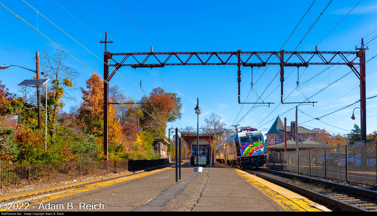 Splashes of Color in Maplewood: Playing beautifully off of the fall foliage, NJ Transit's vibrant Pride Unit passes through Maplewood station on a test run on Election Day 2022.