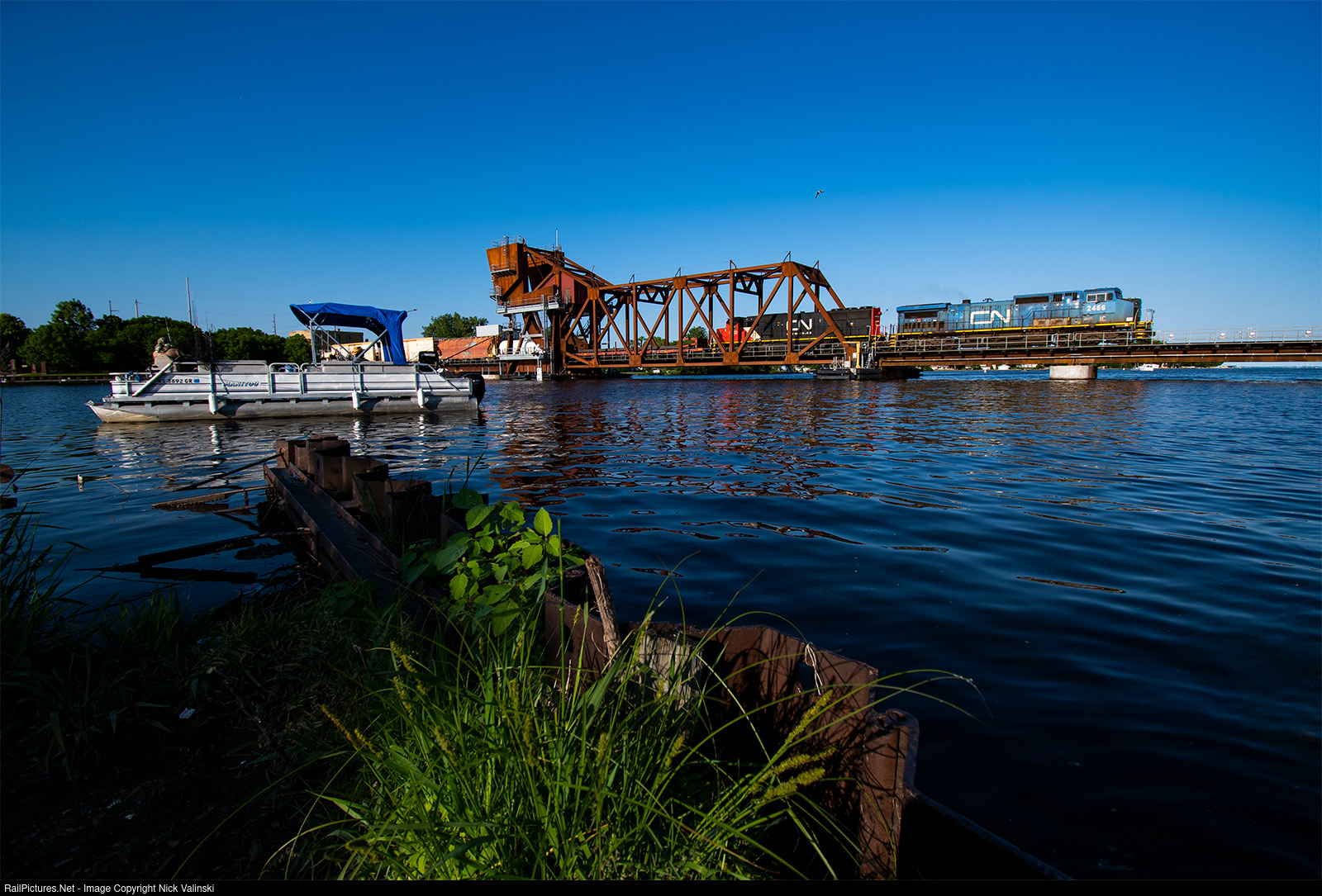 IC 2466 leads CN train L588 over the bridge in Oshkosh while some fisherman send out casts from the boat on a beautiful summer evening.