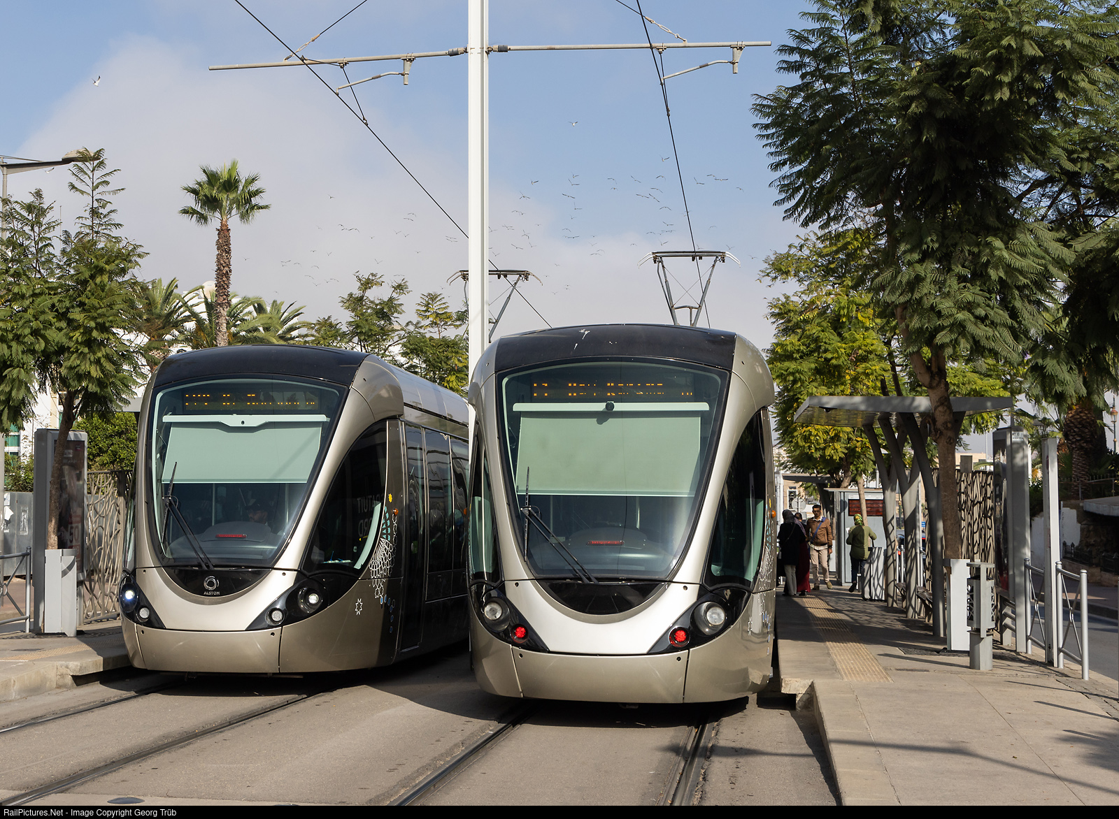 | Two "Alstom Citadis" tramways of the 26 kilometer long Rabat-Salé system, openend in 2011, meeting at the place du 16 november stop. The Rabat tramway has two lines and operates 66 Citadis vehicles, running in pairs.