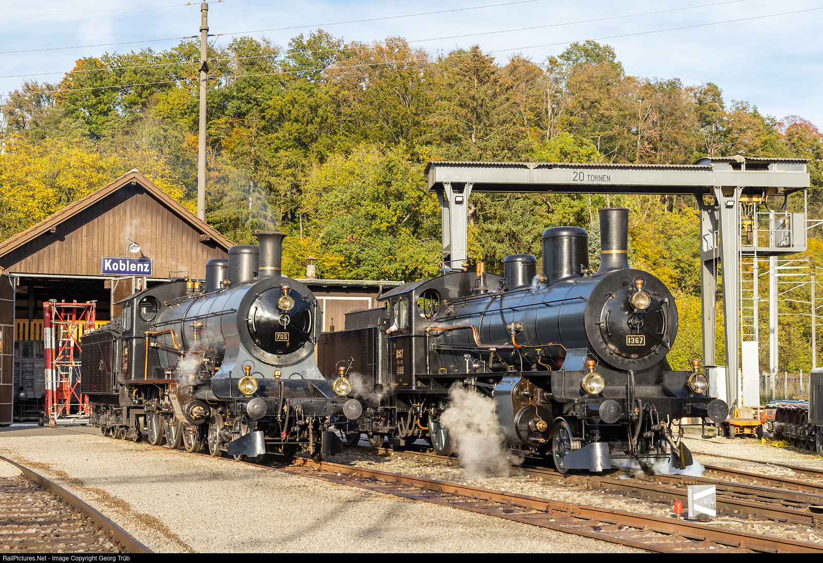 Steamlocomotives of SBB Historic in front of the shed in Koblenz on the occasion of the large steam event with the "Spanisch-Brötli-Bahn. From left to right: 4-6-0 express train steamlocomotive A 3/5 # 705, built by SLM in 1904 for the SBB, maintained and operated by the steam group Zürich (Verein Dampfgruppe Zürich VDZ) in Brugg AG. 2-6-0 "Mogul" B 3/4 # 1367, built by SLM in 1916 and based in Brugg AG.