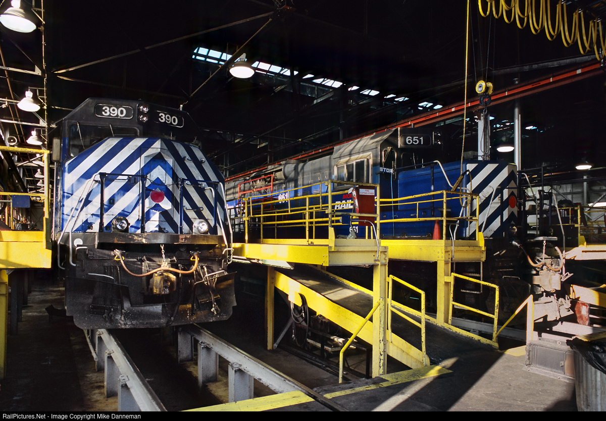 Montana Rail Link EMD F45 No. 390 and SD19-1 No. 651 sit inside the diesel house at the railroad’s locomotive shop complex at Livingston, Montana, on October 11, 2005. No. 651 is a rebuilt SD9, the former MRL No. 609, and before that, EJ&E No. 601.