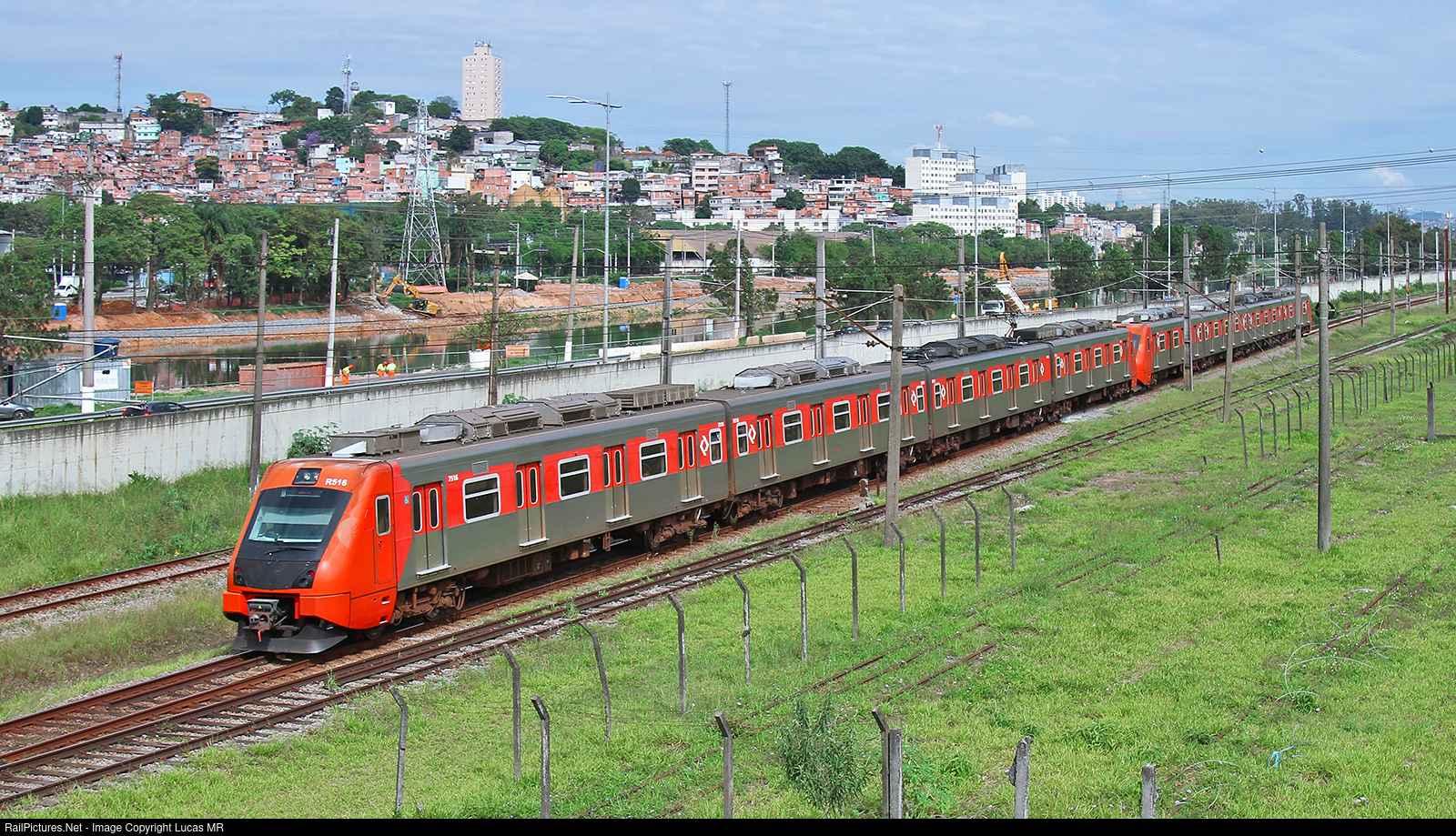 | Commuter train R516 photographed in the old Ceasa yard, between Vila Lobos and Ceasa stations, at CPTM Line 9 Emerald. |