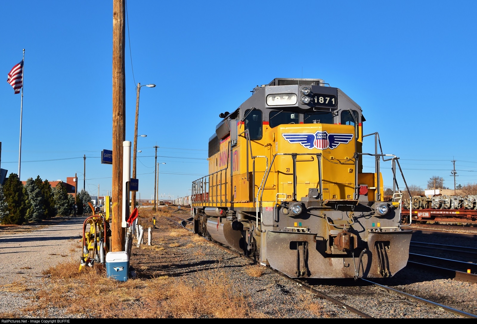 UP 1871 (SD40-2) waits on a siding in Sidney, Nebraska for orders to move cars in the yars.