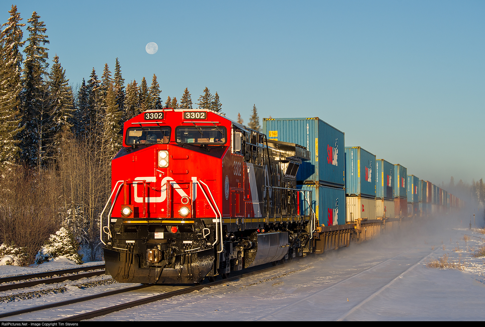 CN AC44C6M 3302 has Q196's train well in hand as the moon looks on up above.