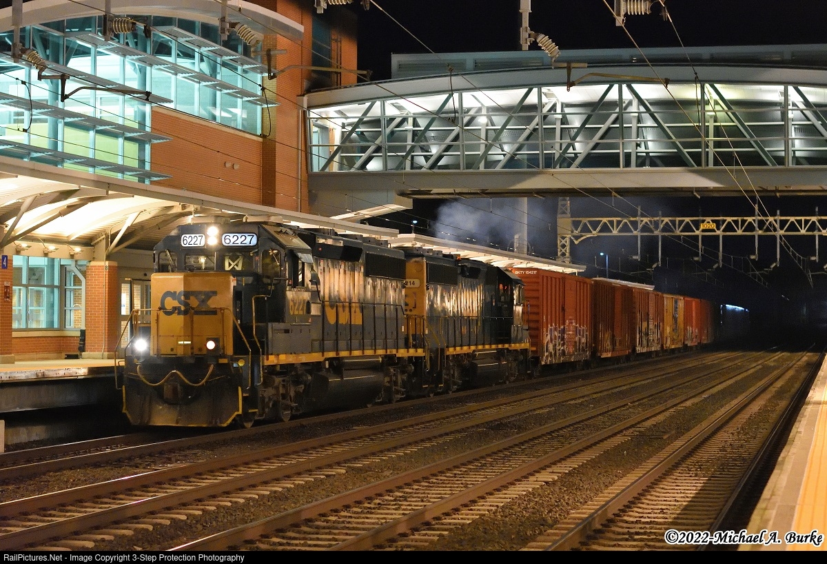 | A pair of CSX GP40-2s head train L015 past West Haven Station at midnight on November 17, 2022. Tonight's Cedar Hill local job has 7 loaded boxcars of beer for Star Distributor in West Haven and 11 empty trash gondolas for City Carting in Milford. |