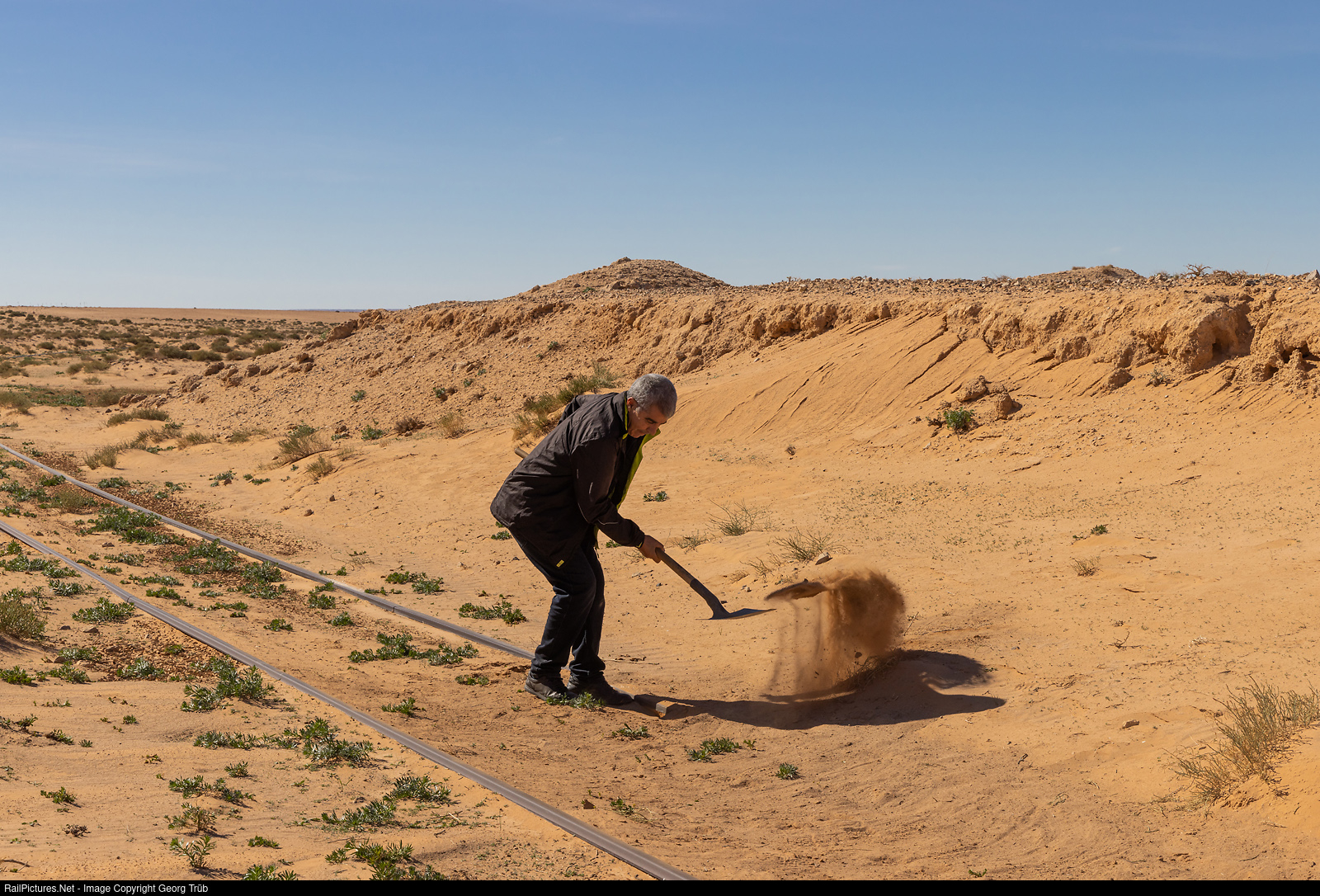 Clearing the track from blown in sand in the curve after the crossing of the dried out Oued El Oglat creek some kilometers before Ain Beni Mathar in the east moroccan desert. So the ORIENTAL DESERT EXPRESS from Oujda to Bouarfa was able to continue the journey after about half an hour.
