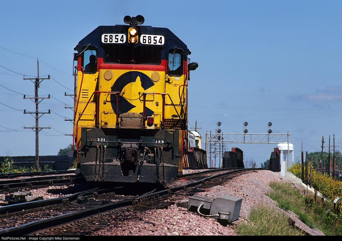| The conductor on a CSX transfer out of C&NW’s Proviso Yard looks back at his train rocking and rolling through the crossovers at Bellwood, Illinois, on September 1, 1991. The train is entering Indiana Harbor Belt/Baltimore & Ohio Chicago Terminal trackage at CP Hill. |