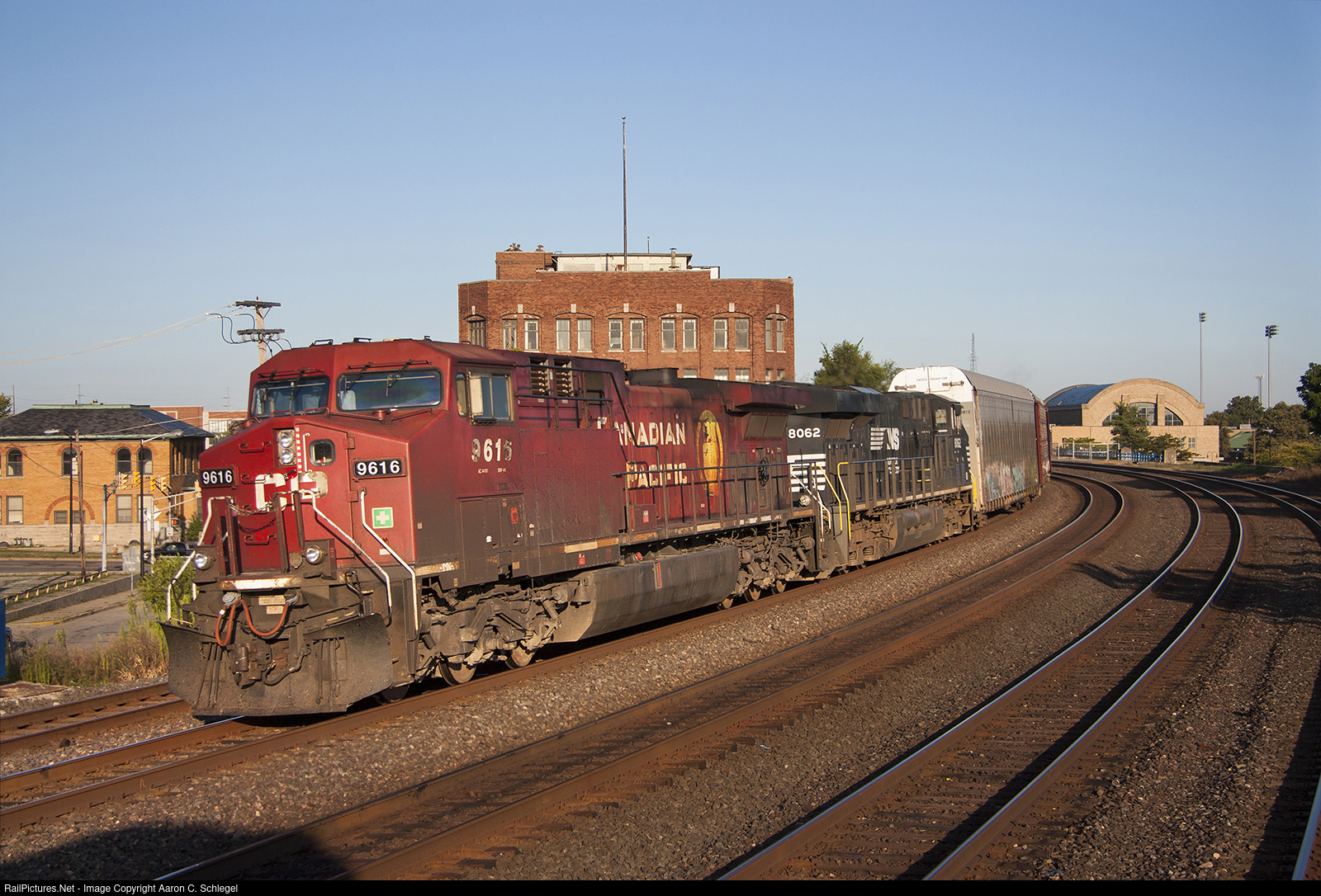 | CP 9616 Blasts East on Main 2 through South Bend, Indiana. CP 437 is the CN / NS interlocking. In the background on the Right can be seen the former GTW, South Bend Passenger Depot now home to the Union Station Technology Center. Peeking above the train is the old Studebaker Administration Building. |