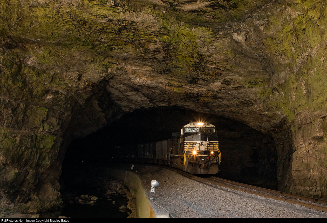 | Norfolk Southern Train U40 is seen exiting the eastern portal of Natural Tunnel just outside of Duffield, VA., with 14 Coal Hoppers in tow. |
