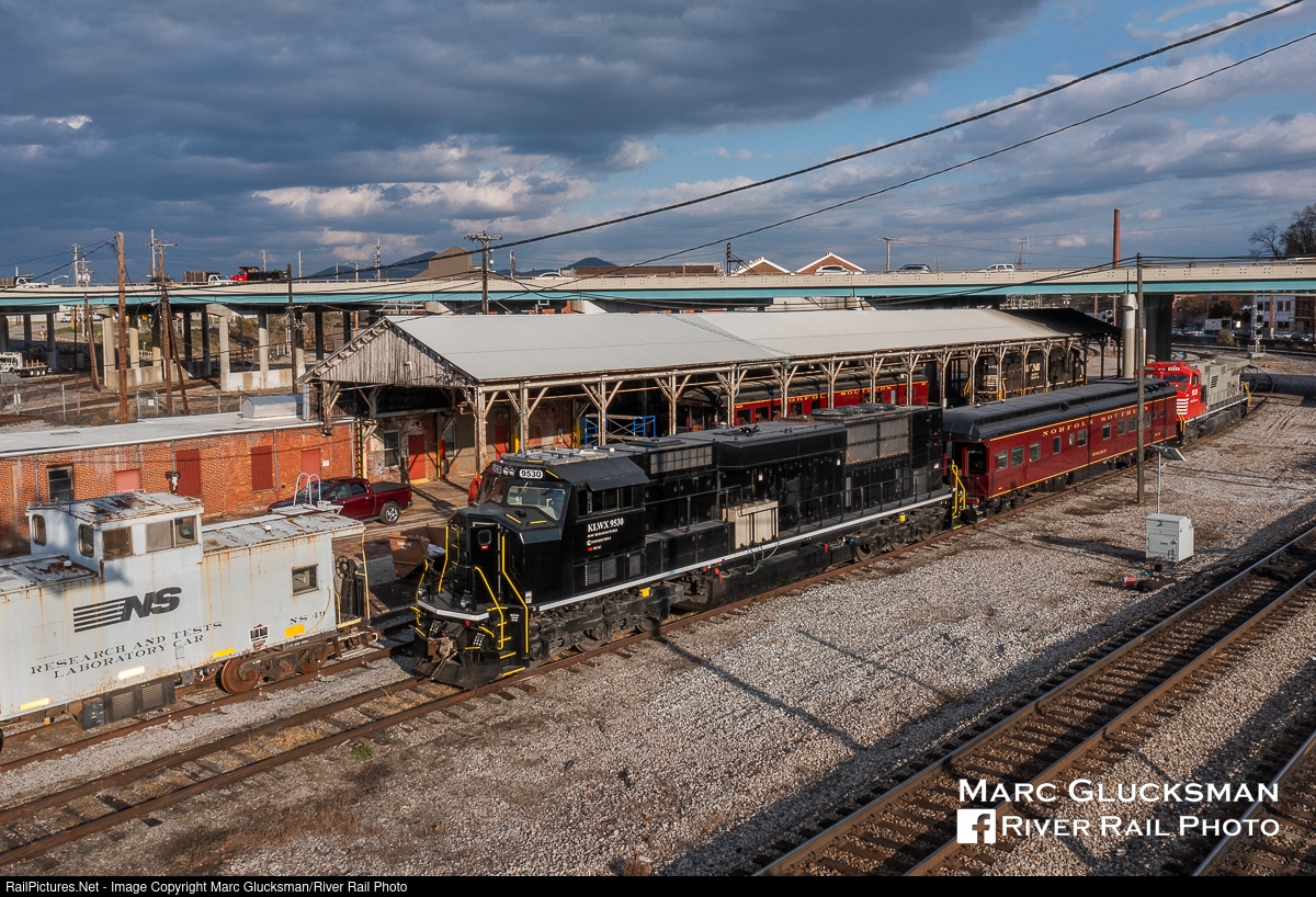 The Tier 4 Conversion. Tying down for the night in the Norfolk Southern Corp Coach Yard in Roanoke, Virginia after testing for the day, the train of KLWX 9530 (KLWX 4400 ACT4, ex-BNSF 9530, née-BN 9530, SD70MAC, EMD, 2/1995), NS 32 (Research Car/Dynamometer Car, NYC 1, NS 800785) and KLWX 8520 (ex-NS 8520, AC44C6CF [CAF], née-NS 8946, C40-9W [GE] 2/1996) sits next to NS 49 (Research And Tests Laboratory Car Caboose) on Friday, November 18, 2022. This unusual lashup has been running in the area to test the Knoxville Locomotive Works (KLWX) products on the road, including on a coal train. The Tier 4 Compliant rebuild offers the potential for a new life to the veteran EMD.