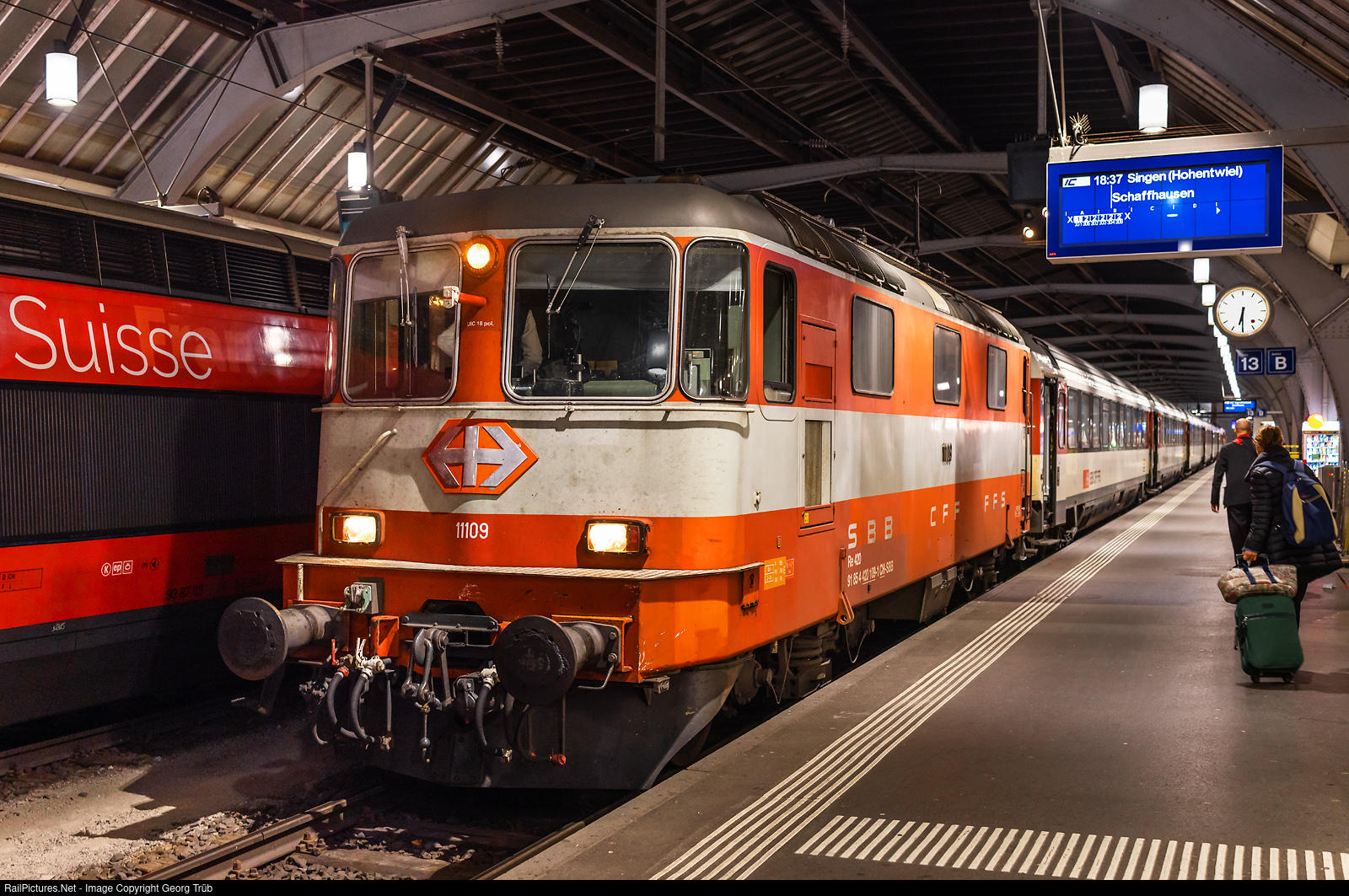 Re 420 # 109 (Re 4/4 II # 11109) of the SBB, in the orange/lightgrey "Swiss Express" paint scheme, is ready in Zürich main station with the IC 182 to Schaffhausen-Singen. The locomotive was taken over by the SBB on march 10th, 1967 and is more then 55 years in service now. Since 1975, the # 11109 has the nice lightgrey/orange "Swiss Express"-paint scheme.